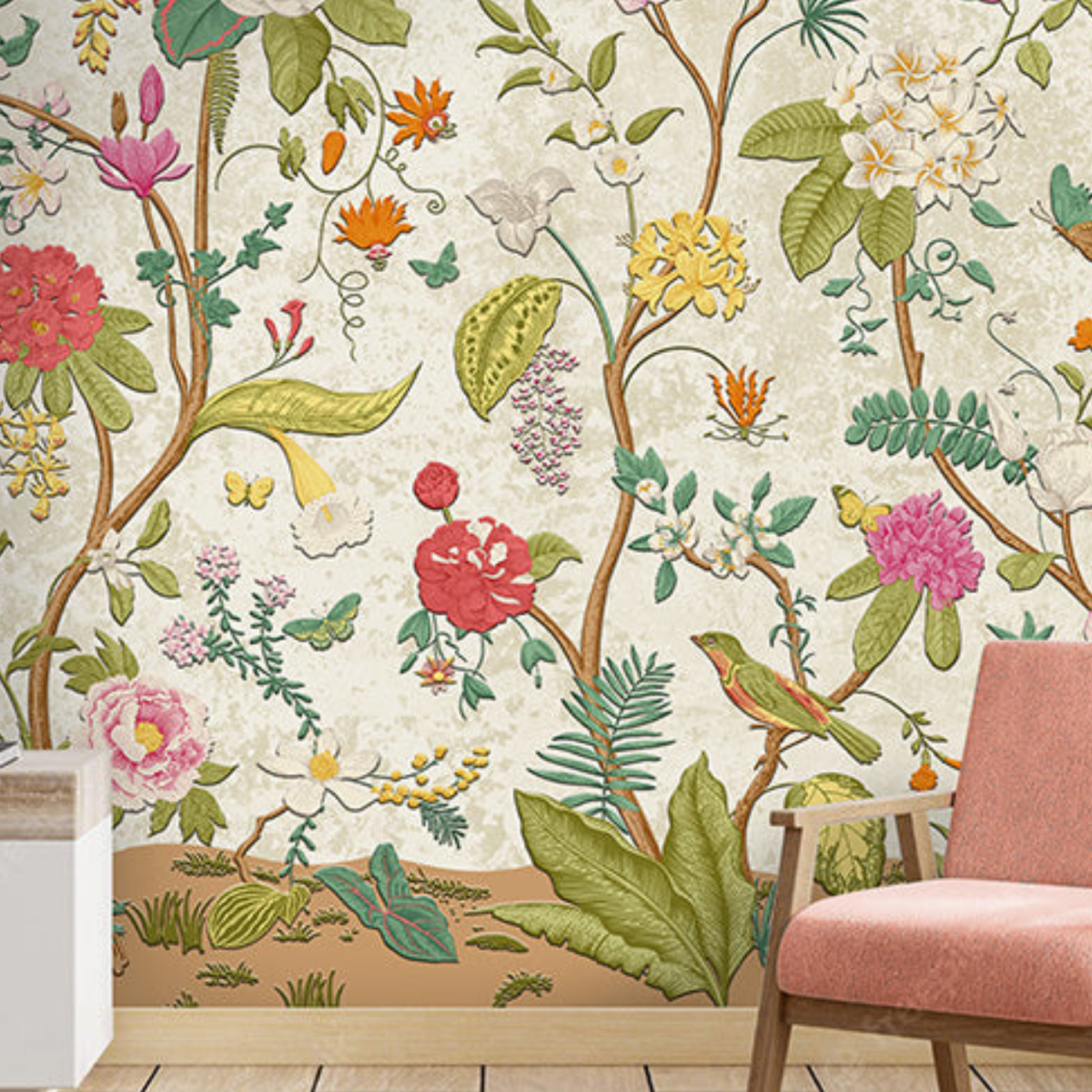A vibrant and detailed Chinoiserie-style design featuring flowering branches, diverse blossoms, butterflies, and various birds against a subtly textured light background.