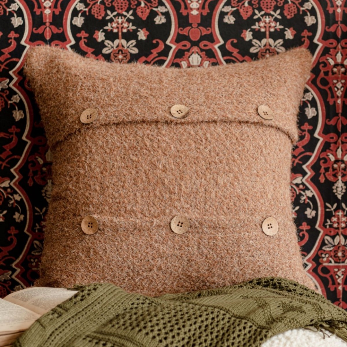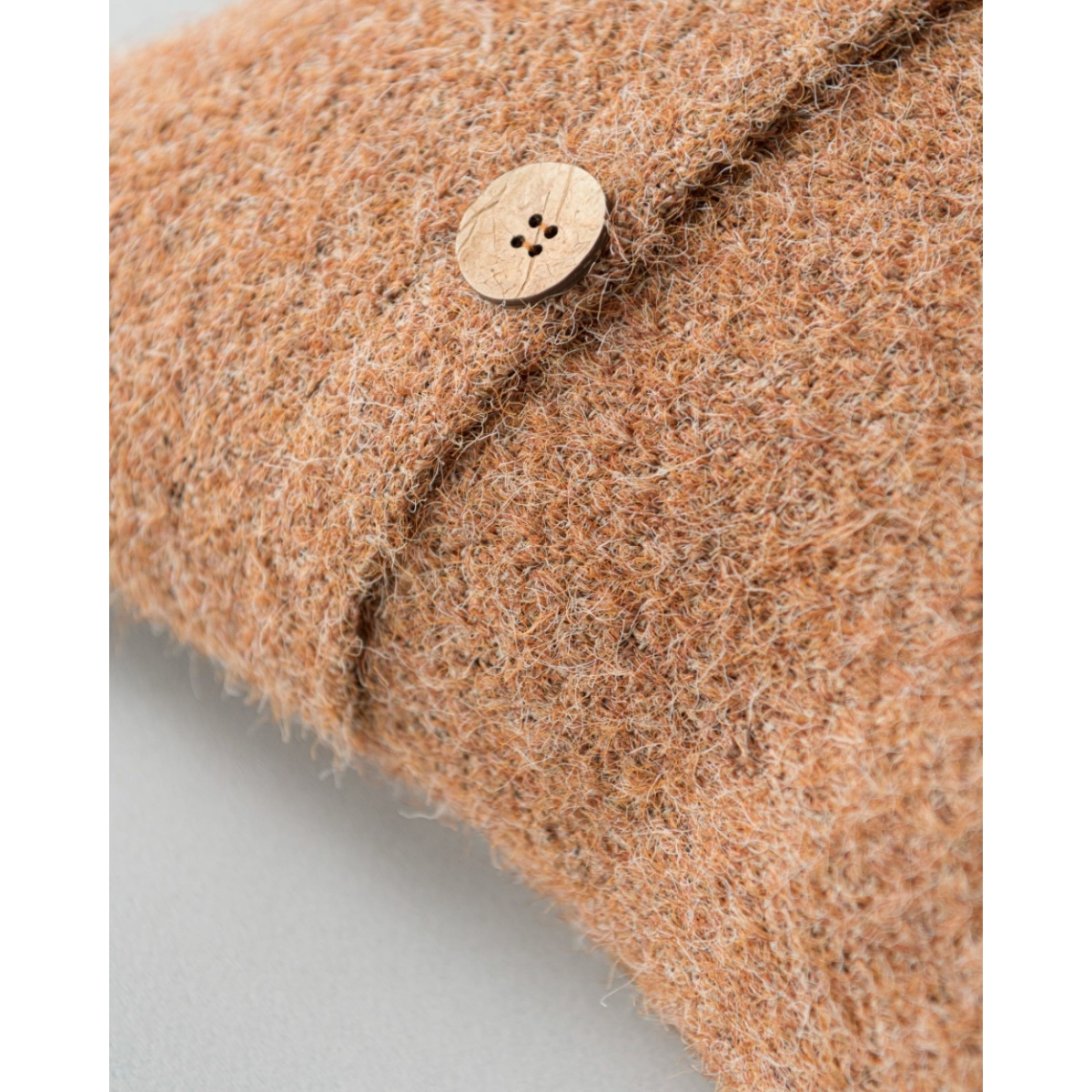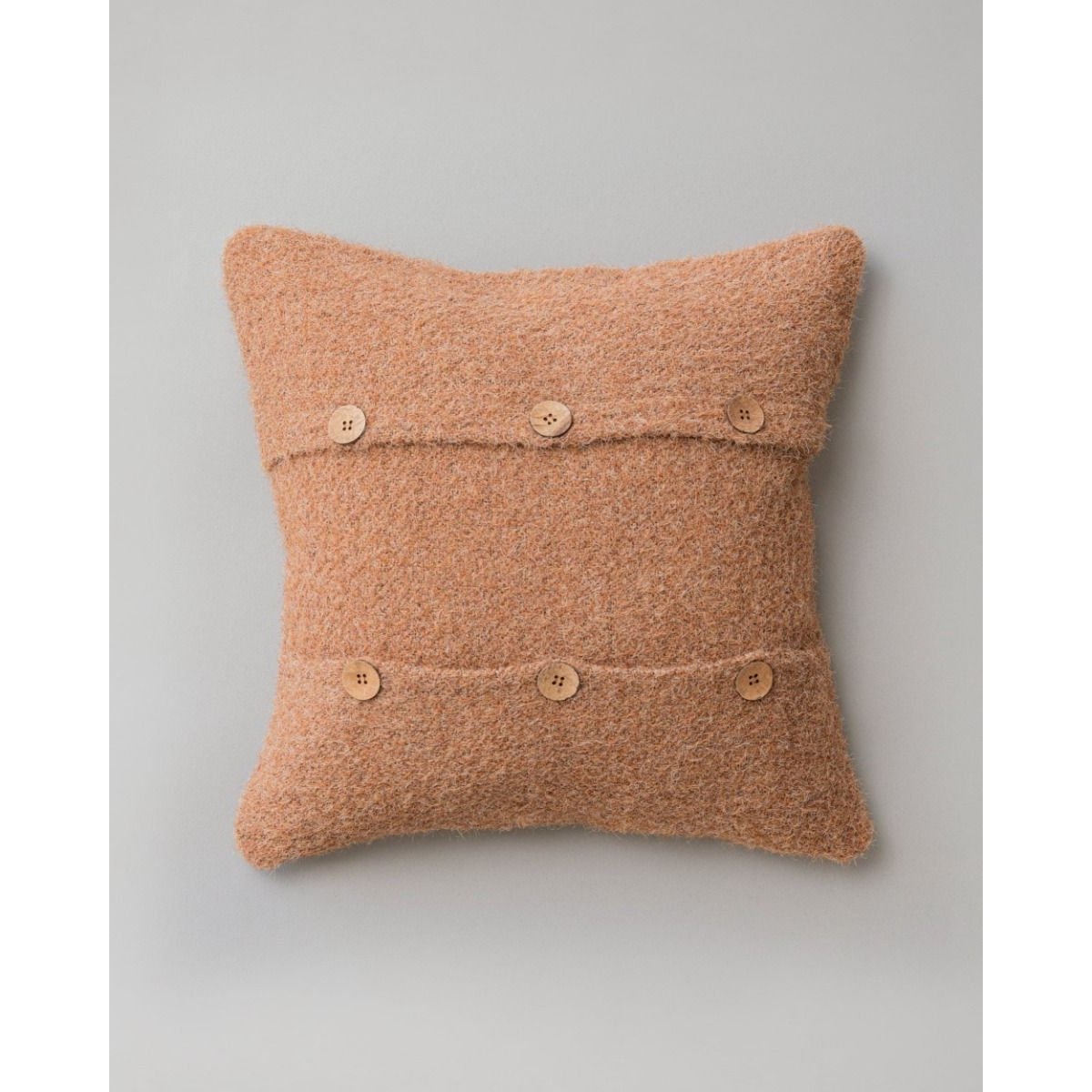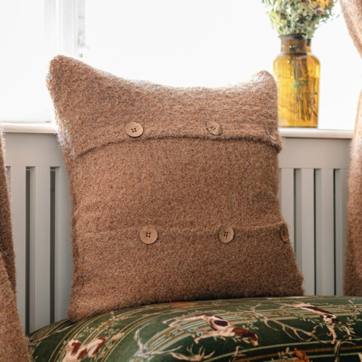 73% Polyester, 27% Jute, Filling : Duck feather, Finishing : Six decorative wooden buttons