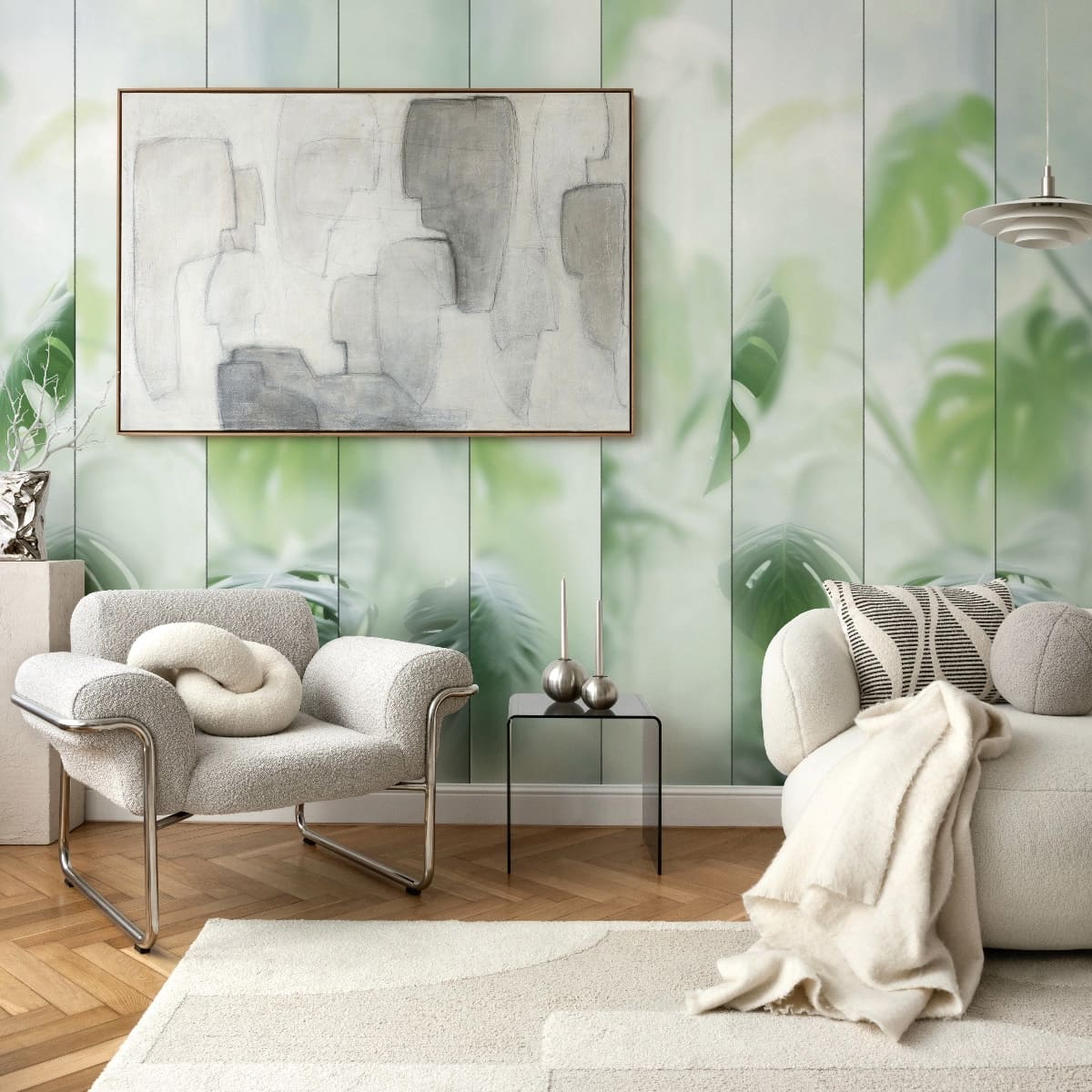 Misted Monstera mural captures the soothing beauty of blurred leaves seen through a soft, glass-like surface, creating a calm and dreamy atmosphere. The gentle silhouettes and muted green tones evoke a sense of quiet nature and peaceful retreat. Perfect for living rooms, bedrooms, or wellness spaces, this wallpaper brings serenity and modern elegance to any interior.