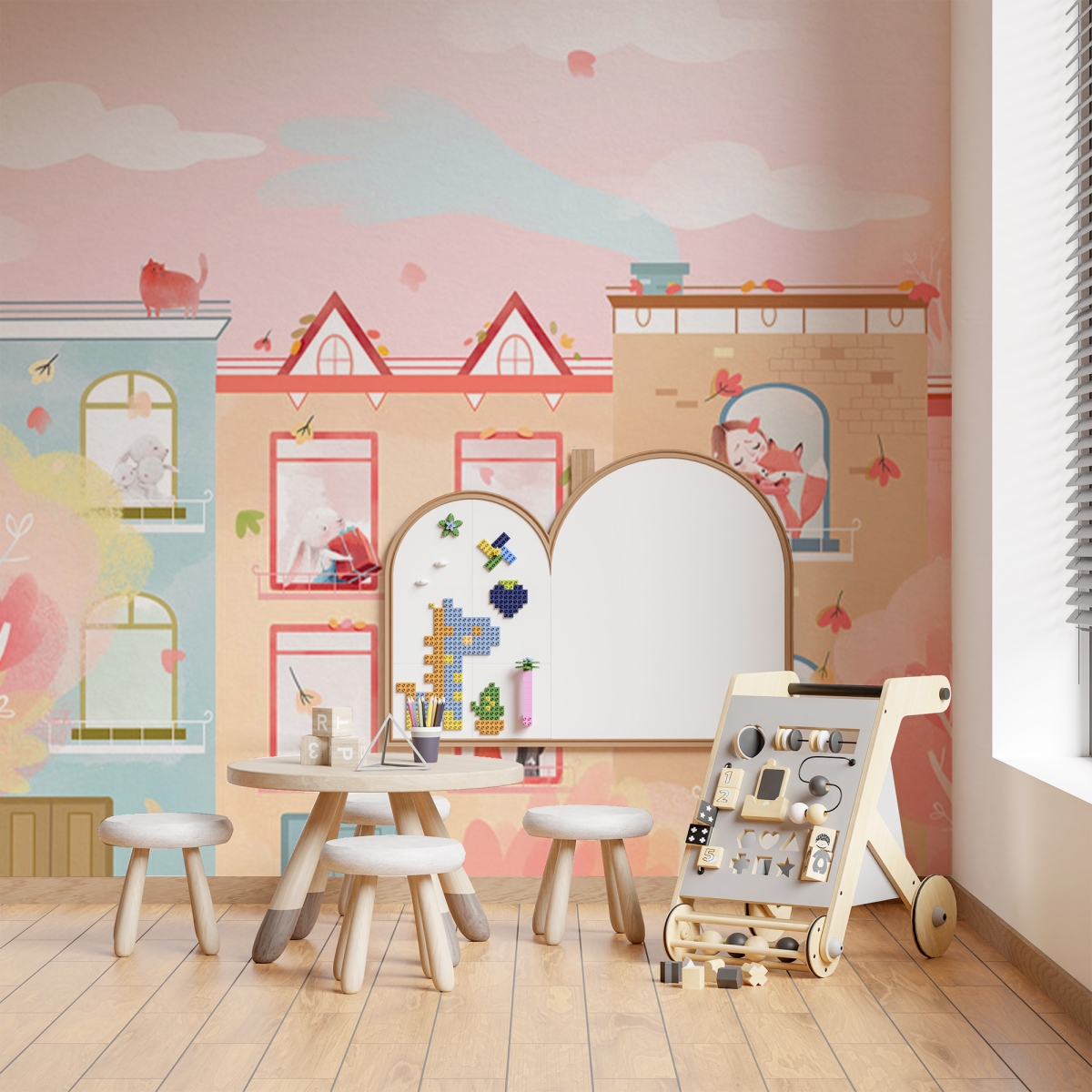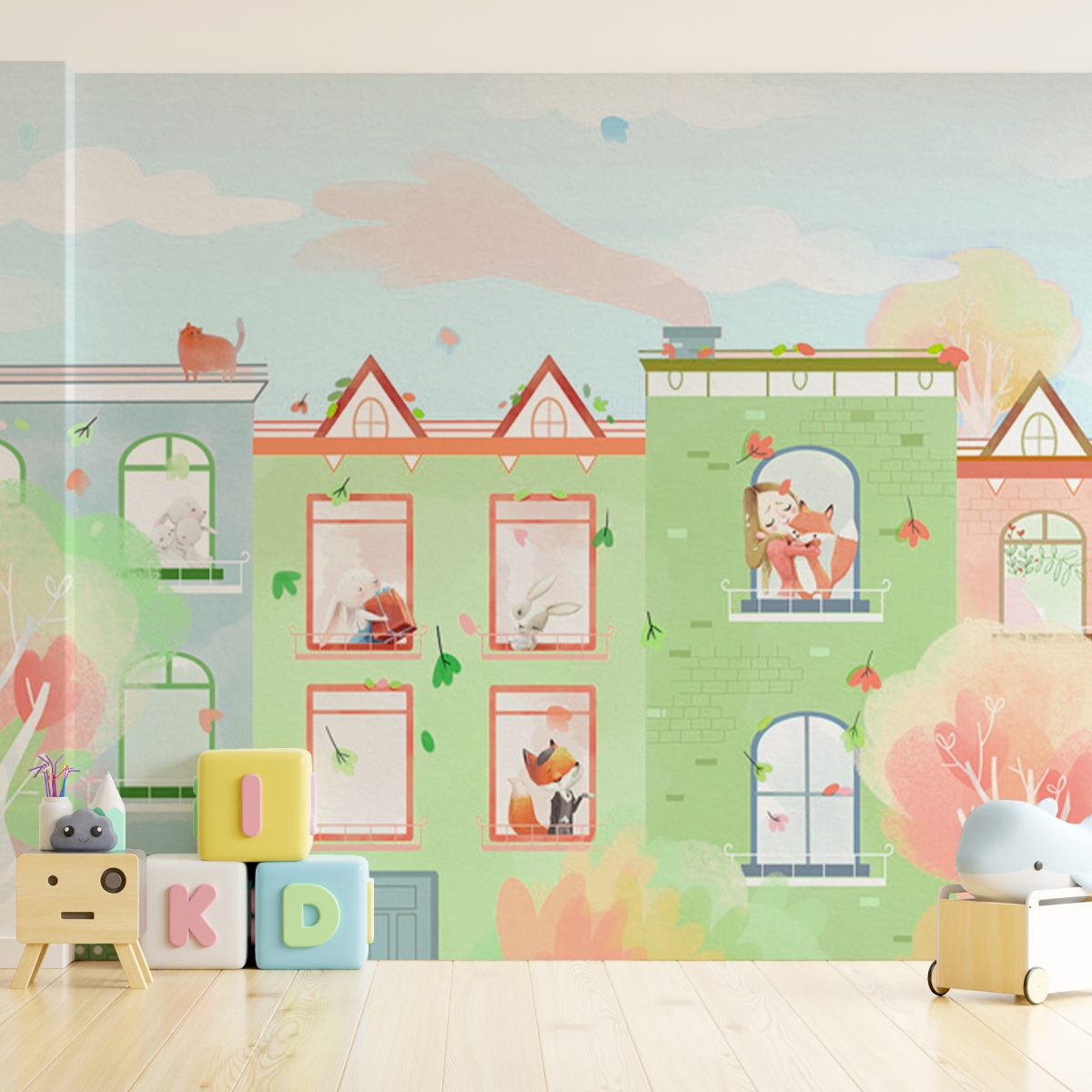 Celebrate the changing seasons with this delightful "Autumn Lane" wallpaper. Featuring tiered city houses and whimsical animal friends, this mural uses soft textures and airy clouds to give any room a sense of depth and playfulness. It’s not just a wall decoration; it’s an invitation to tell a new story every day.