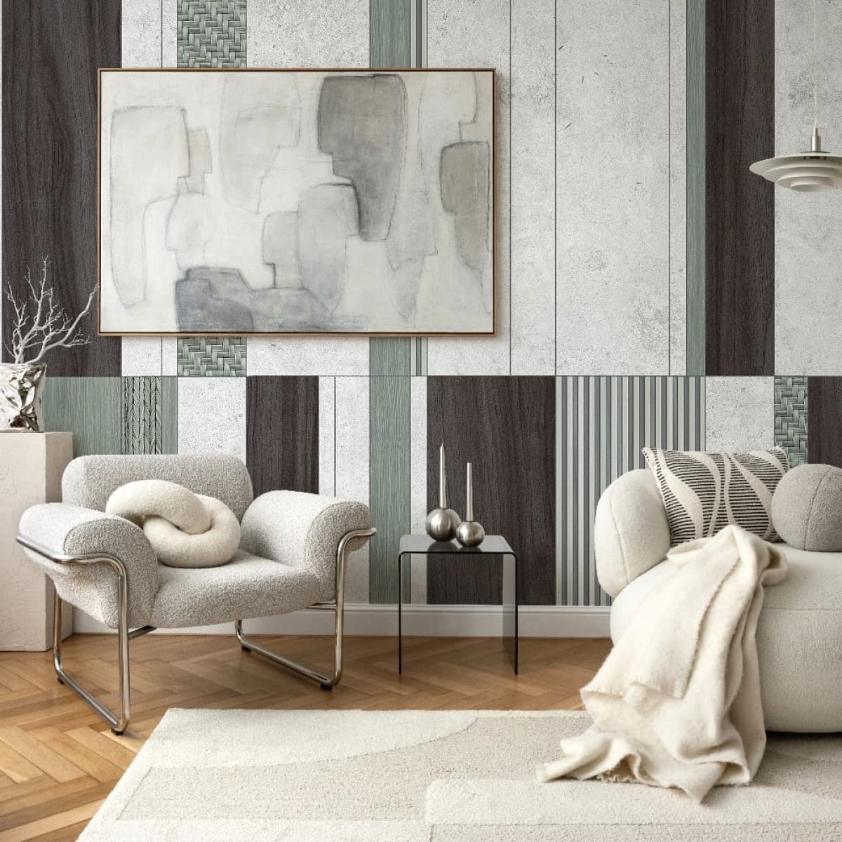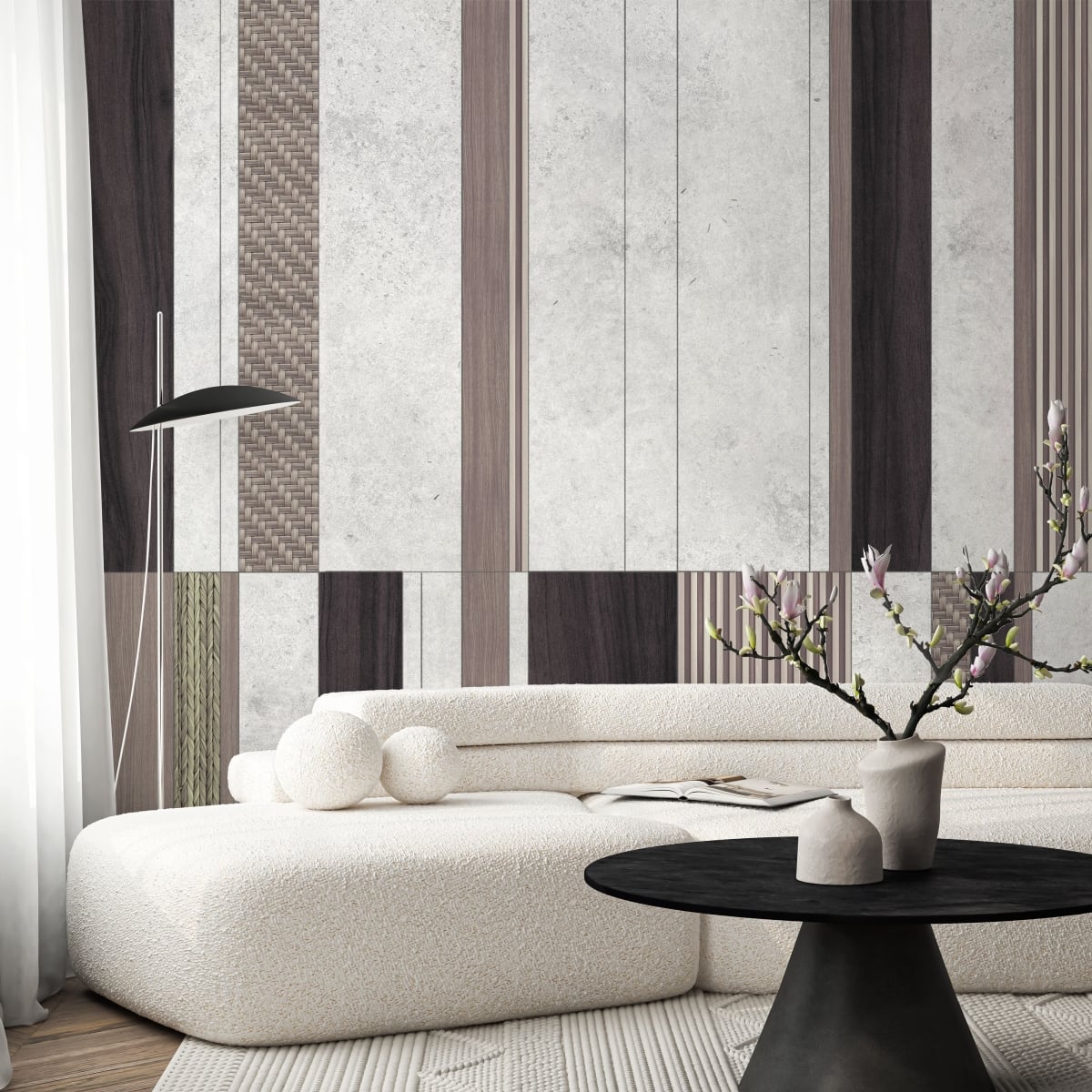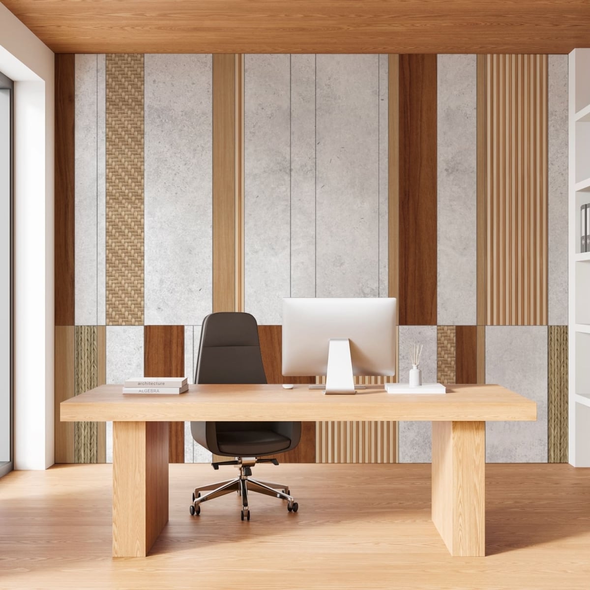 This wood grain geometric panel mural features clean lines and balanced shapes inspired by Scandinavian design principles. The natural wood tones add warmth while the structured pattern brings a modern architectural feel to the space. Perfect for living rooms, bedrooms, or offices, it creates a cozy yet refined interior atmosphere.