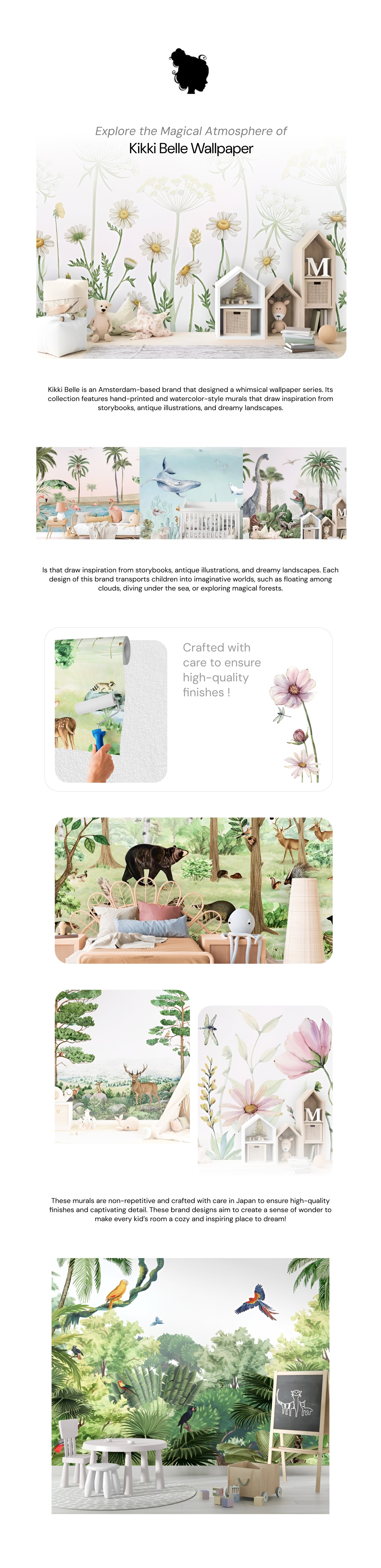 Step into a whimsical woodland world with this detailed "Forest Jive" wallpaper. Featuring deer, foxes, owls, badgers, squirrels, and more amongst tall trees and gentle foliage. A touch of forest magic for your walls.
