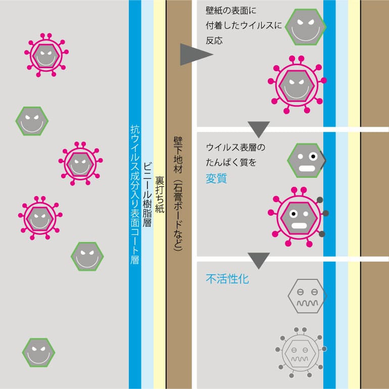 * The antiviral wallpaper only has the function of “altering (= inactivating) the protein on the surface layer” against the virus on the surface, but it cannot be decomposed. When the virus is inactivated, it loses its infectivity.