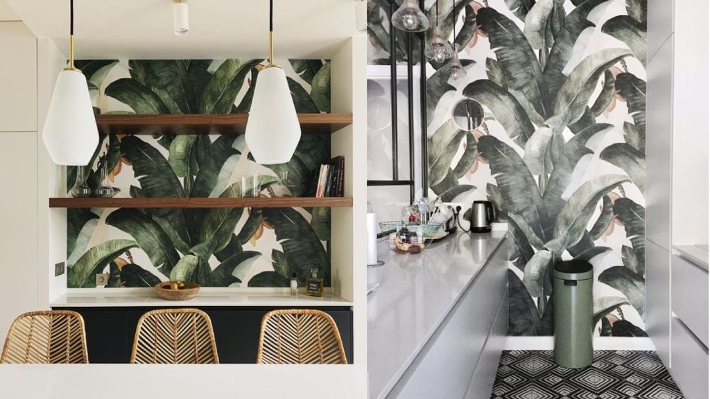 Tropical kitchens are a very distinct touch on interior design compared to the monochromatic style. Placing tropical wallpaper in the kitchen makes the kitchen atmosphere warm and bright. Styling a tropical kitchen goes one of two ways. It is either the bold leafy and forestry themes or it is either the sealife perspective. The leafy theme can include fruit, trees, plants, wildlife and animals wallpaper, while the sea life can include wallpaper that pictured water animals, corals, shells, and more.