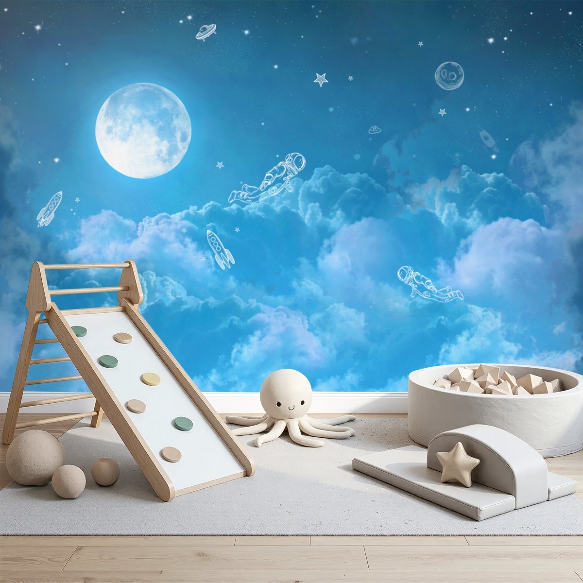Transform your child's room into an otherworldly playground with this enchanting design features a luminous full moon surrounded by plush, dreamy clouds in vibrant, deep blue. Whimsical line-art astronauts and rockets float past glowing stars, inviting little ones to explore the furthest reaches of their imagination. It’s the perfect backdrop for bedtime stories, playtime adventures, and inspiring the next generation of space travelers.
