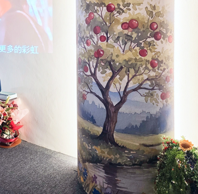 Then, we put the custom mural wallpaper and transformed the surface perfectly. This mural wallpaper features a tree-themed mural that changed into a striking design feature. The pillar after installation, looks deep, character, and a unique visual identity to the karaoke area. This custom mural successfully elevates the ambiance of the karaoke area and helps create a more immersive and memorable environment for guests.