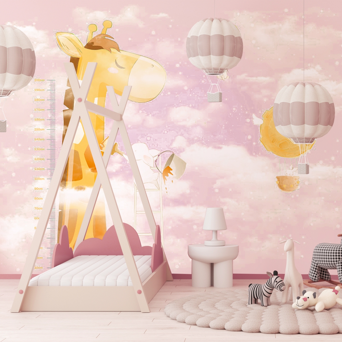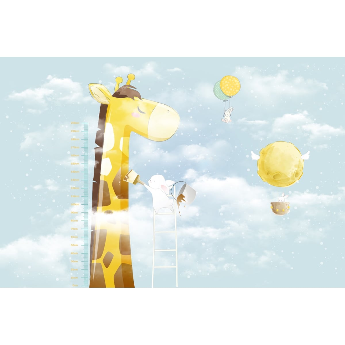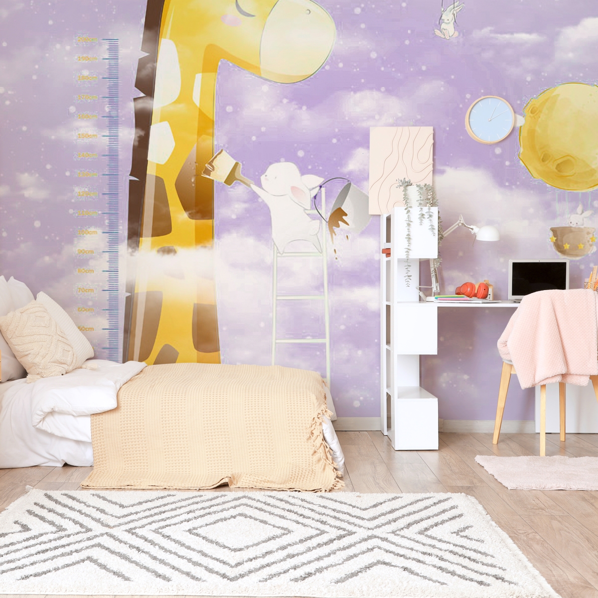 Bring a touch of whimsy and wonder to your child’s room with this charming watercolor nursery mural. Featuring a gentle giraffe reaching for the stars and helpful little bunnies floating through a dreamy, cloud-filled sky, this design creates a serene and playful atmosphere.