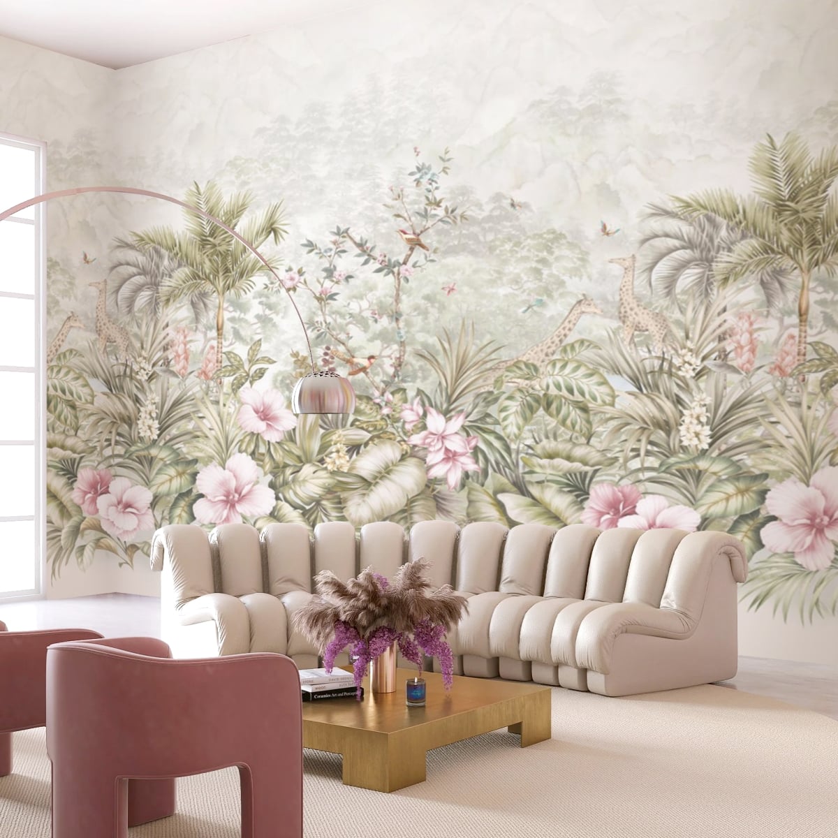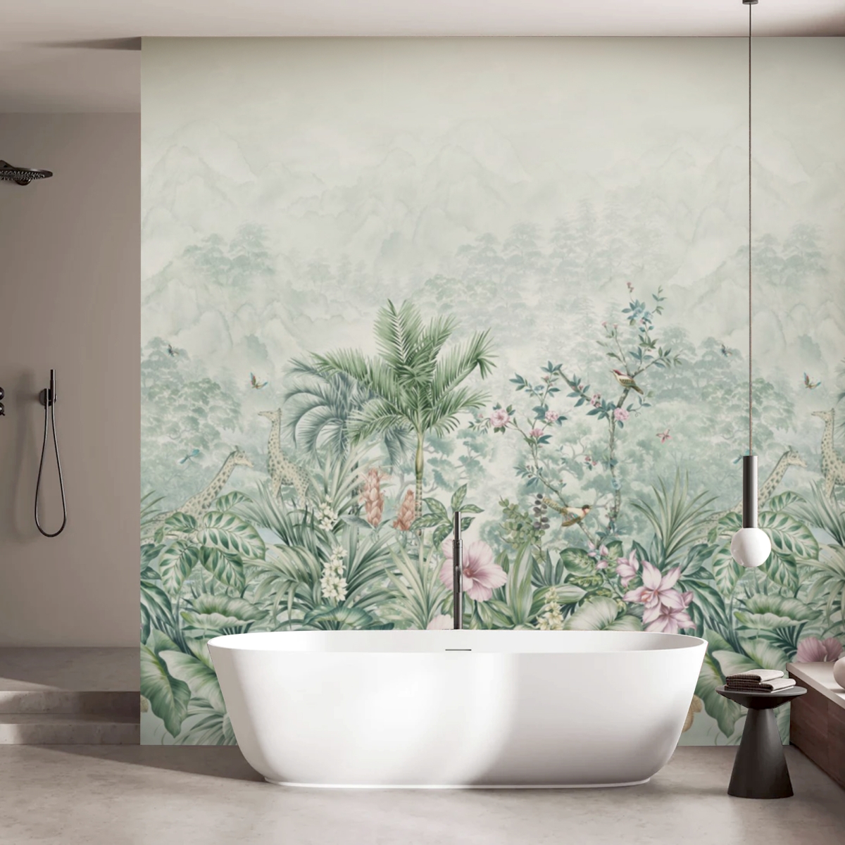 This enchanting wallpaper invites you into a serene tropical world, the backdrop of misty mountains adds depth, making this design feel like a peaceful journey into an exotic, dreamlike landscape. It's the perfect choice for a nursery, child's room, or any space where you want to evoke a feeling of delicate wonder and calm adventure.