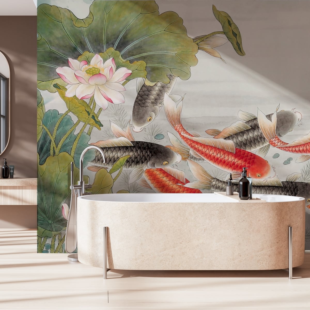 Inspired by the timeless grace of the lotus pond, this mural captures nine koi in a rhythmic dance of prosperity. The delicate interplay of soft ink washes and vibrant cinnabar scales creates a sanctuary of 'Zen' within your home, inviting a sense of fluid movement and eternal peace to your walls