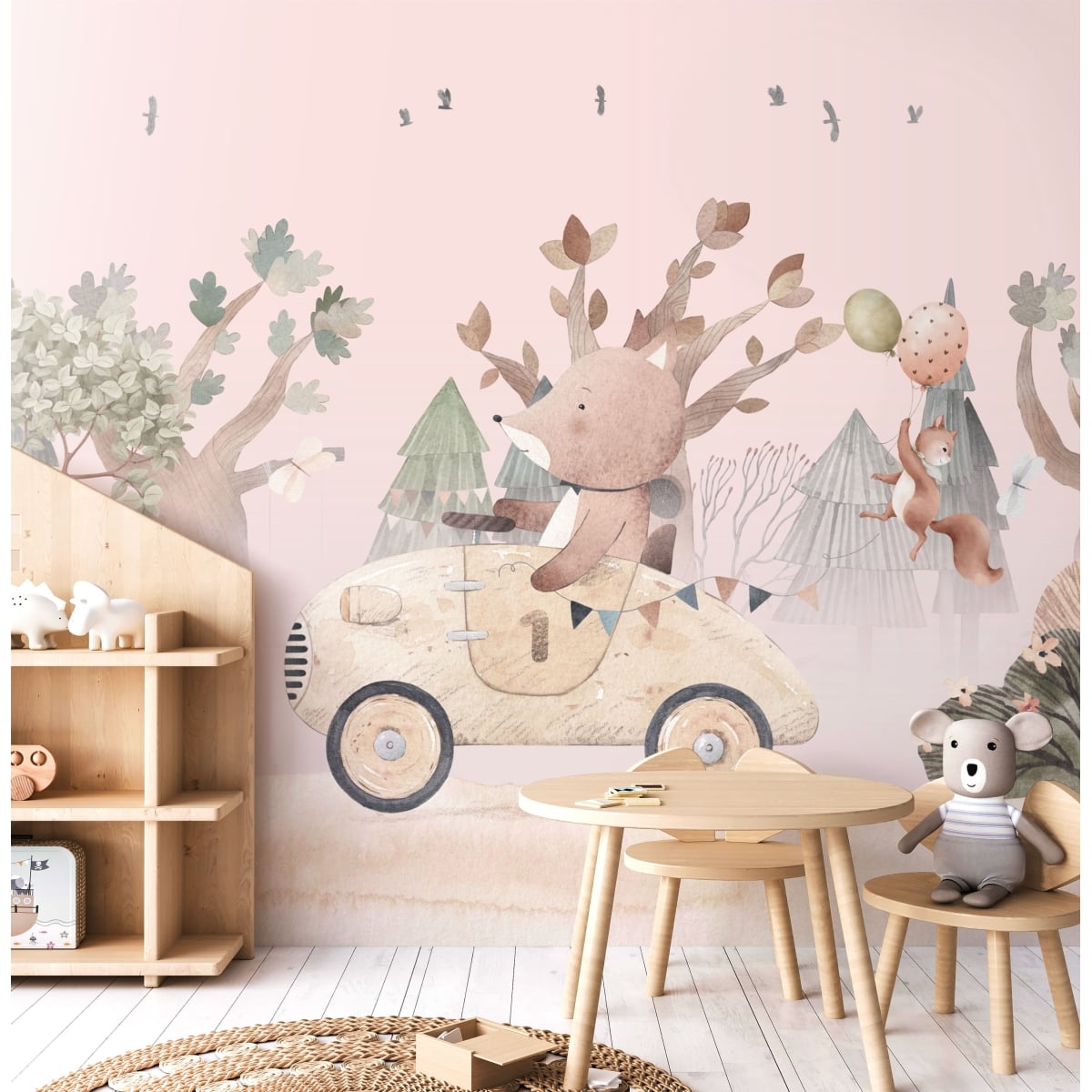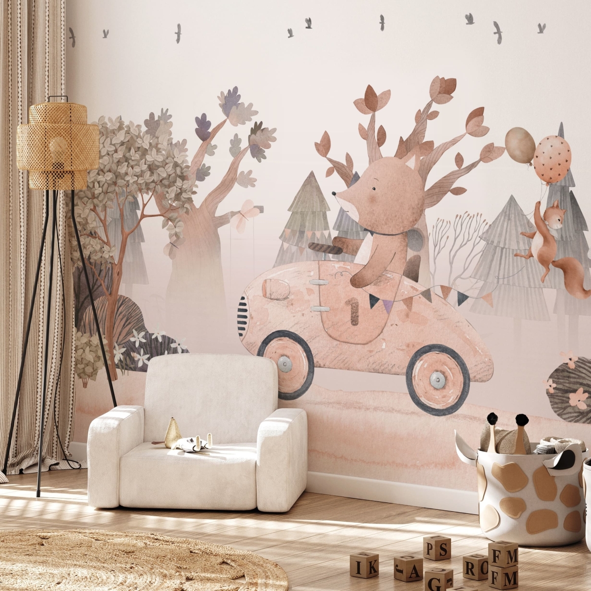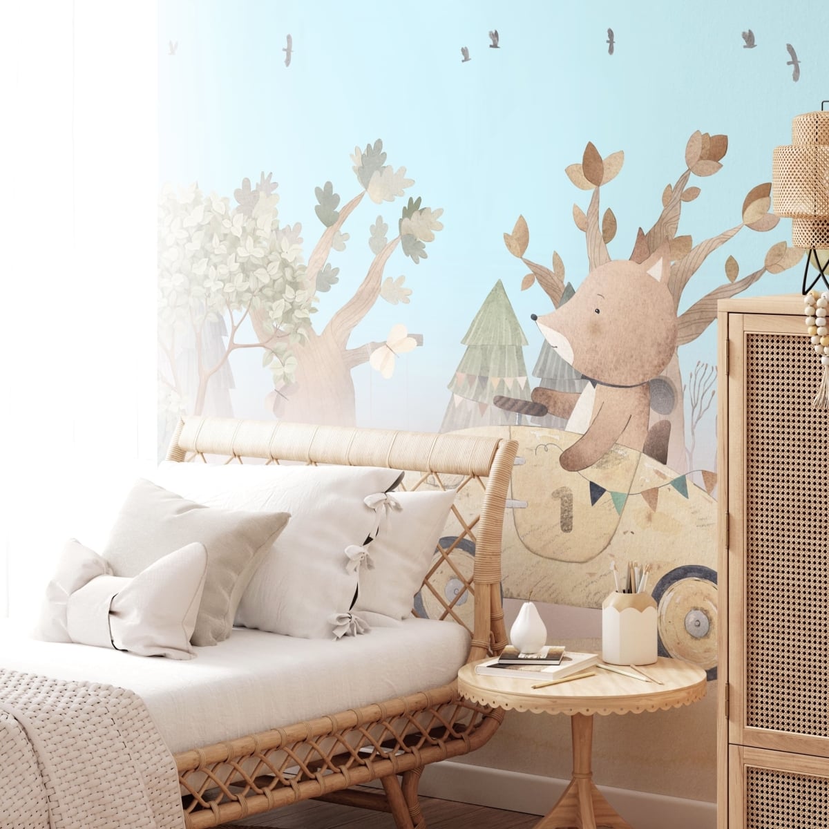 An enchanting forest path unfolds across your wall, guided by delightful woodland friends. This adorable mural blends playful charm with refined illustration, creating a mural that feels both joyful and beautifully composed.