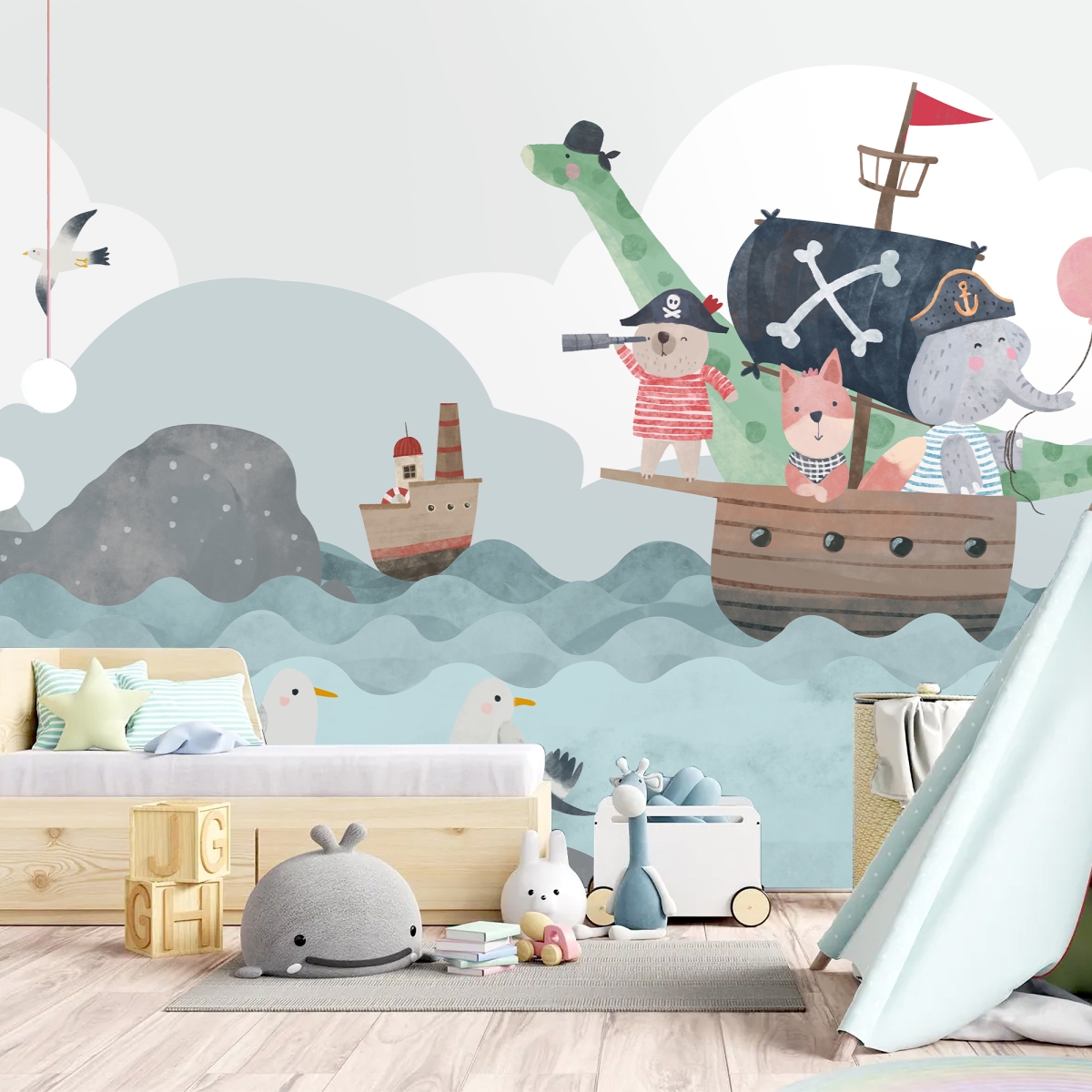 Join the bravest (and cutest) crew on the seven seas: a telescope-toting bear, a fox navigator, and an elephant who brought his own balloon! Even the friendly green dinosaur has come along for the ride. With soothing hues of ocean blue, stormy grey, and soft teal, this wallpaper adds depth and wonder to any nursery or playroom without being overwhelming.