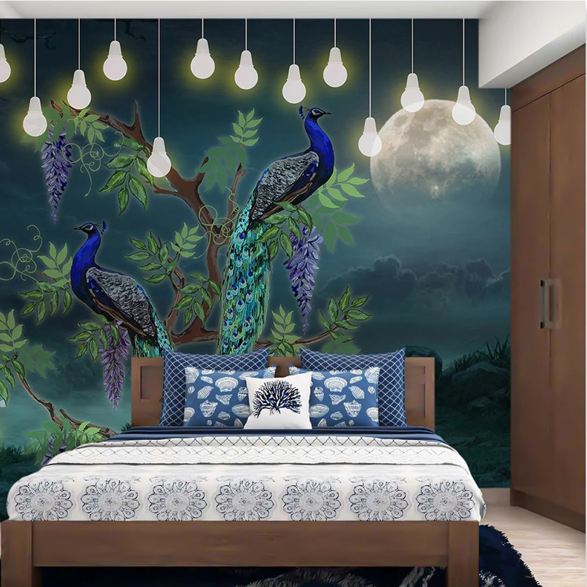 Illuminate your walls with "The Artist's Moonlit Harmony" wallcovering, a captivating blend of nature and light. This design showcases elegant peacocks perched on a tree under a glowing full moon, surrounded by hanging lights that evoke a dreamlike ambiance. The delicate balance of vibrant blues and lush greenery against a moody night sky creates an enchanting, mystical atmosphere. Ideal for creating a serene yet striking statement, this wallcovering brings The Artist's vision of nocturnal beauty to life, making your space a true work of art.