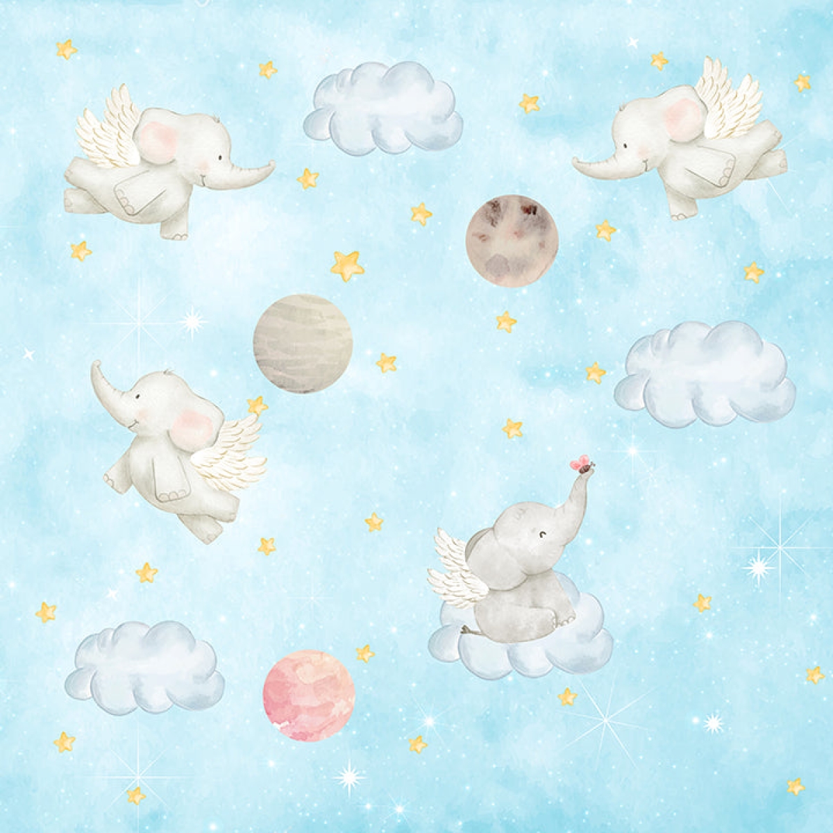 Playful baby elephants with wings explore a magical sky filled with stars and clouds.