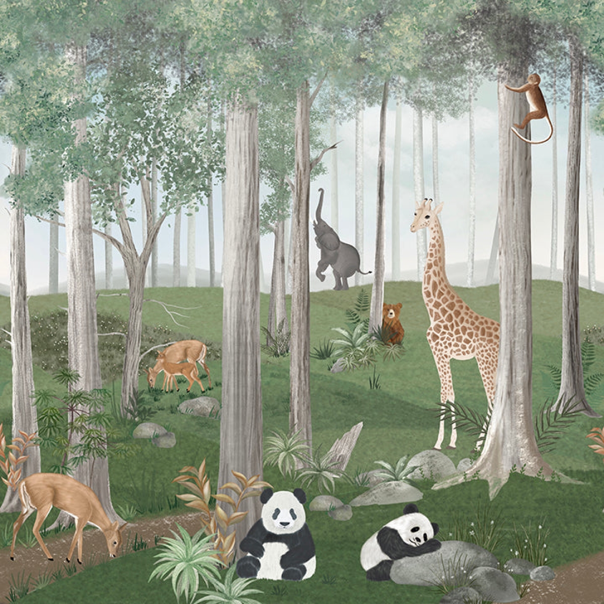 A peaceful forest scene featuring a diverse array of animals, from playful pandas to majestic giraffes.