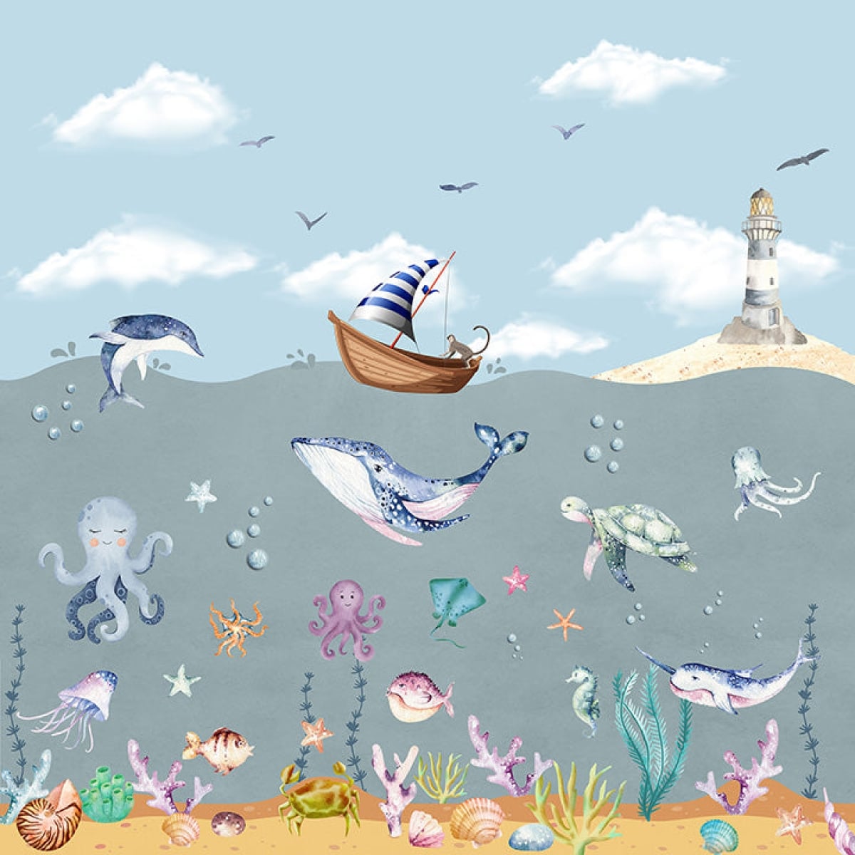 A nautical wallpaper showcasing a boat, sea life, and a lighthouse in a colorful style.
