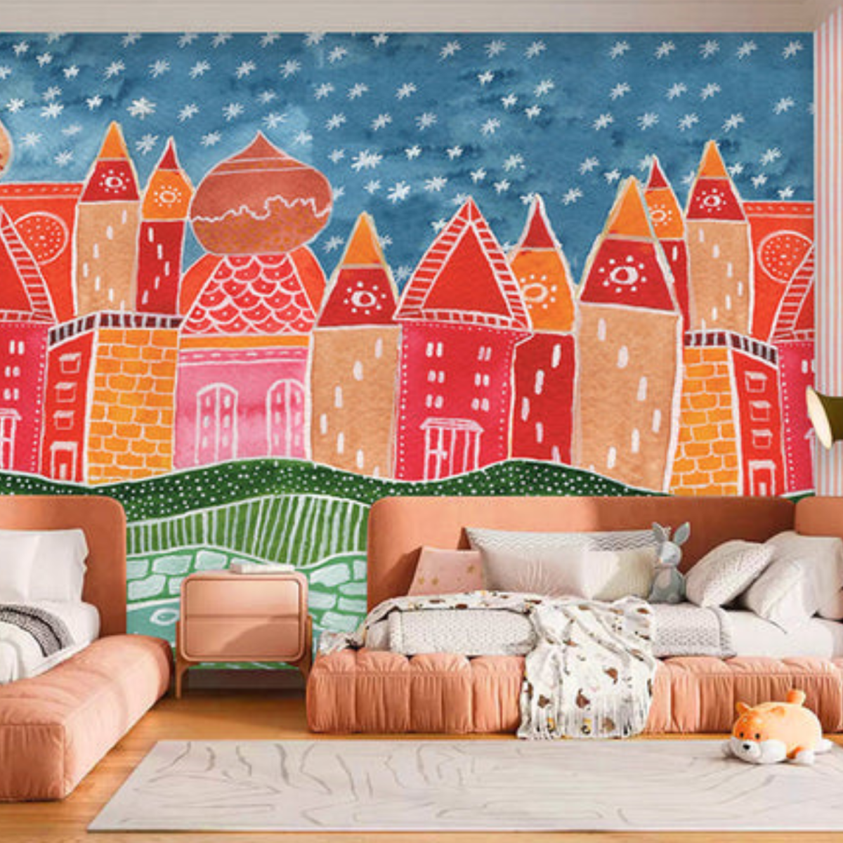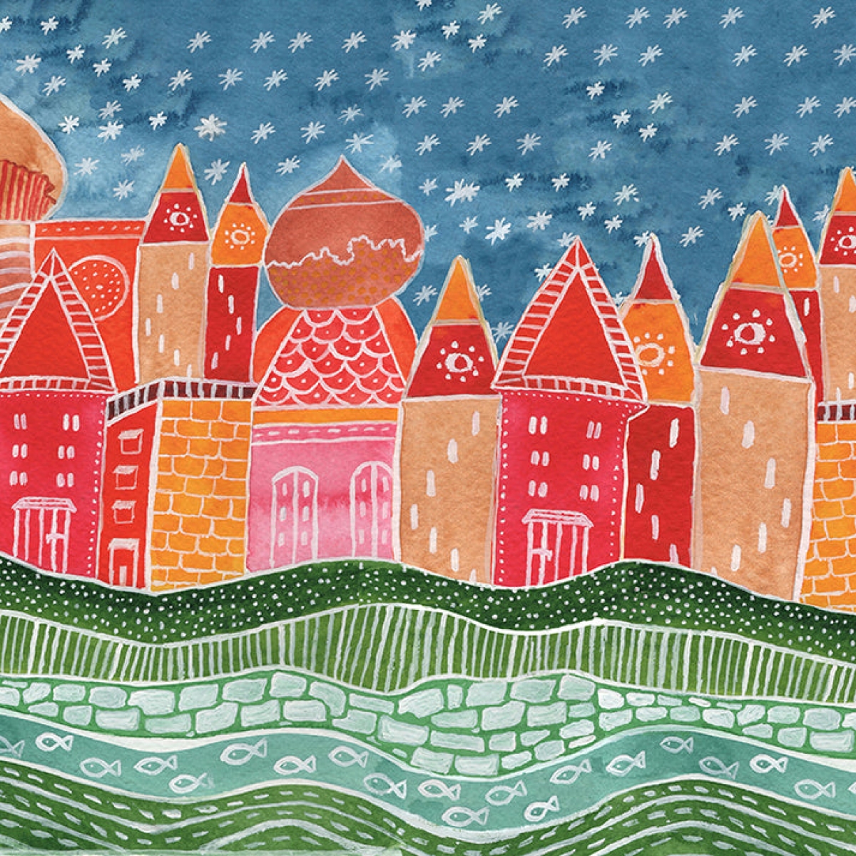 A village scene with colorful buildings, a starry night sky, and a winding river filled with fish.