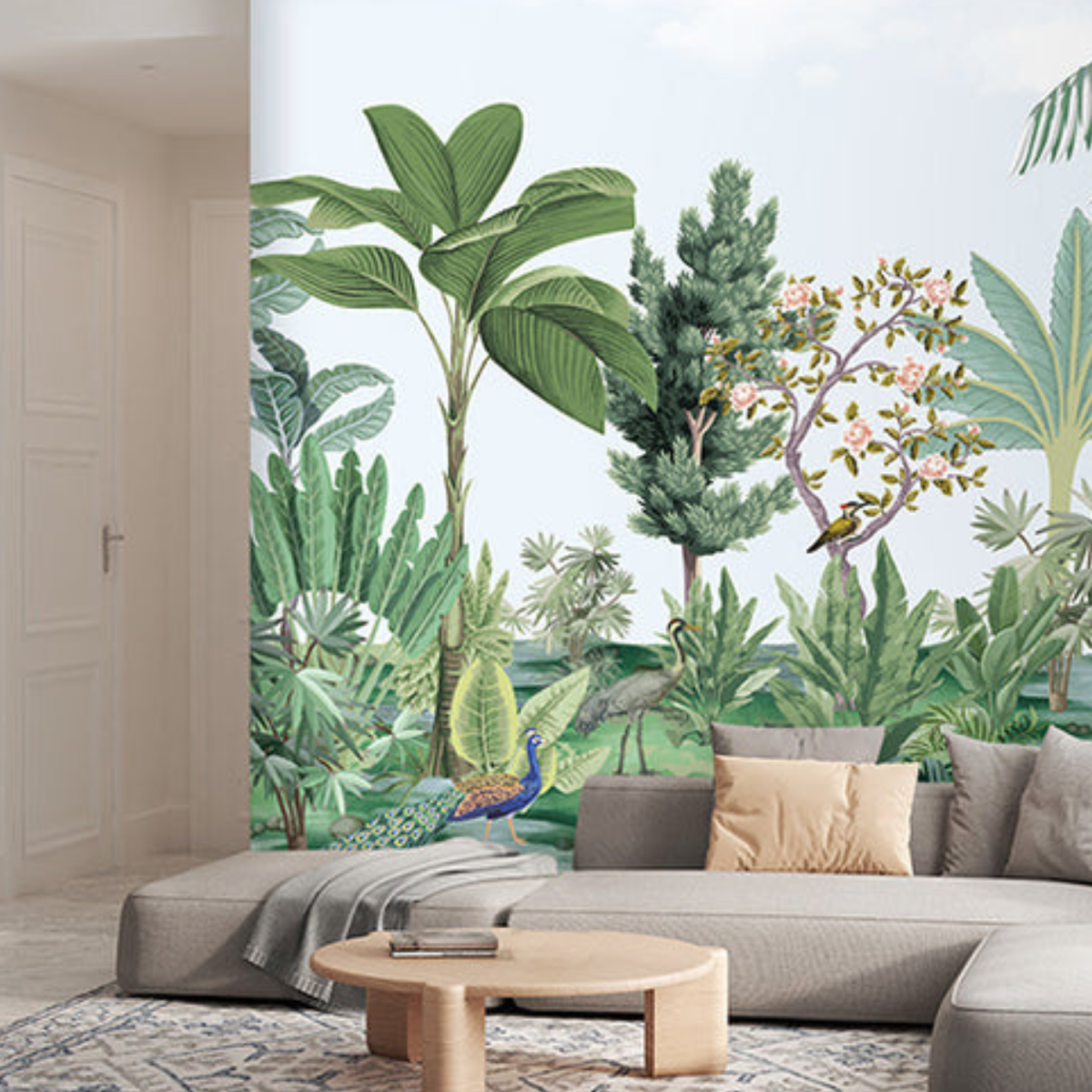 This wallpaper depicts a serene botanical garden scene with a variety of lush green trees and plants, including palm trees, banana plants, and a flowering tree with pink roses. Wildlife such as a peacock, cranes, and a small bird are integrated into the verdant landscape, set against a light background.
