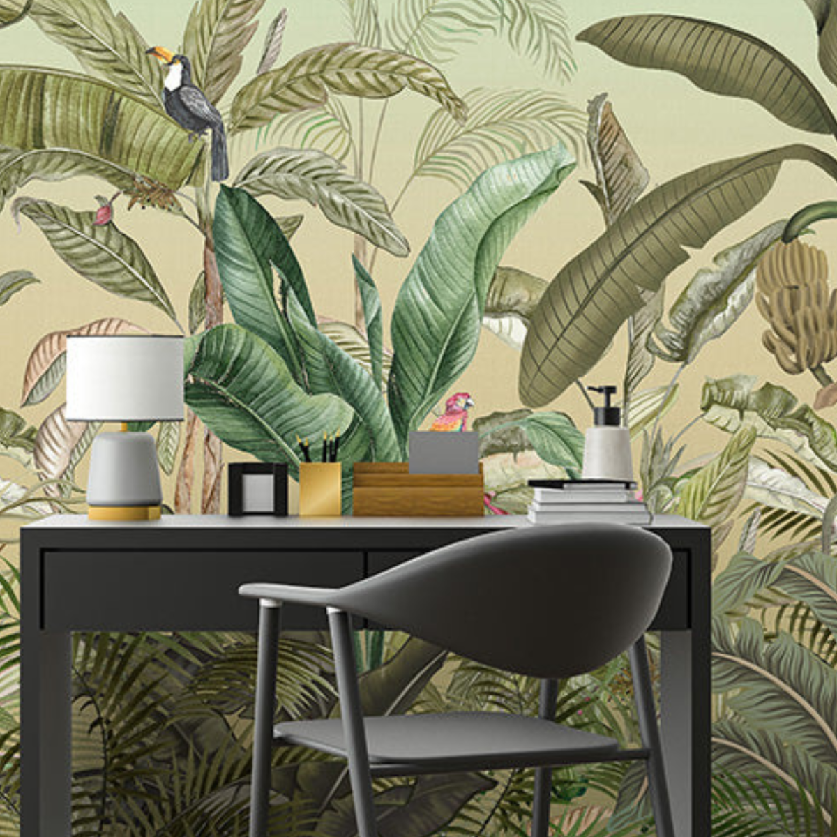 A rich, verdant illustration of a dense tropical jungle with various palm trees, banana plants, and other exotic foliage, featuring several colorful parrots and a toucan.