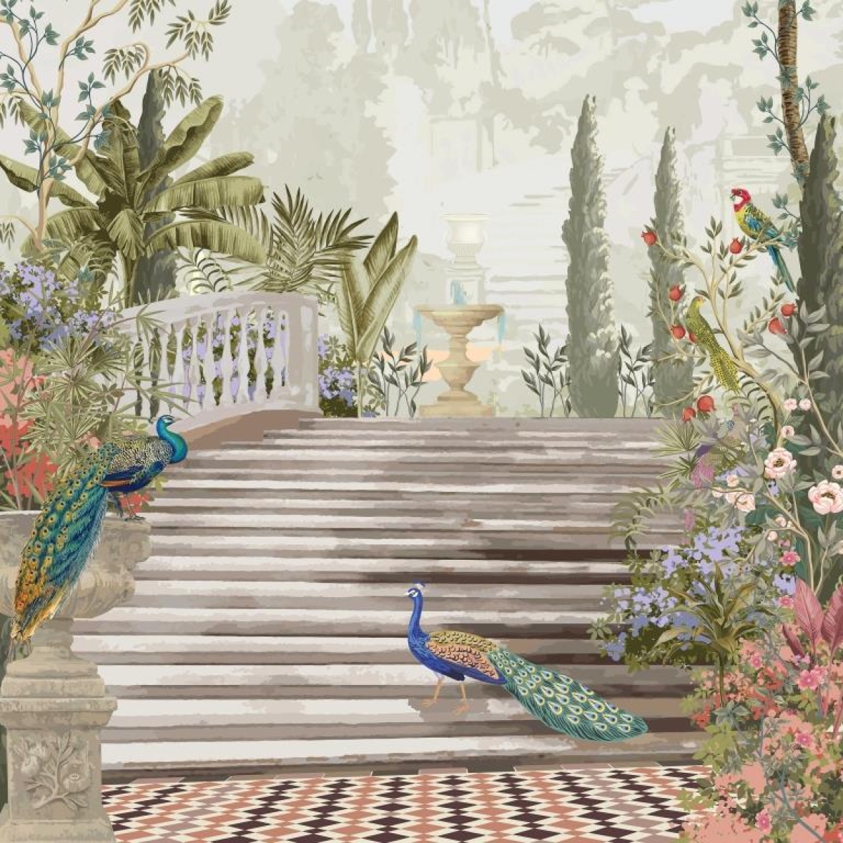 Discover the enchantment of a hidden terraced garden, where peacocks wander amidst a tapestry of flowers and foliage. The stone steps invite exploration, leading towards a tranquil fountain nestled within the lush greenery. This wallpaper evokes a sense of mystery and secluded beauty.