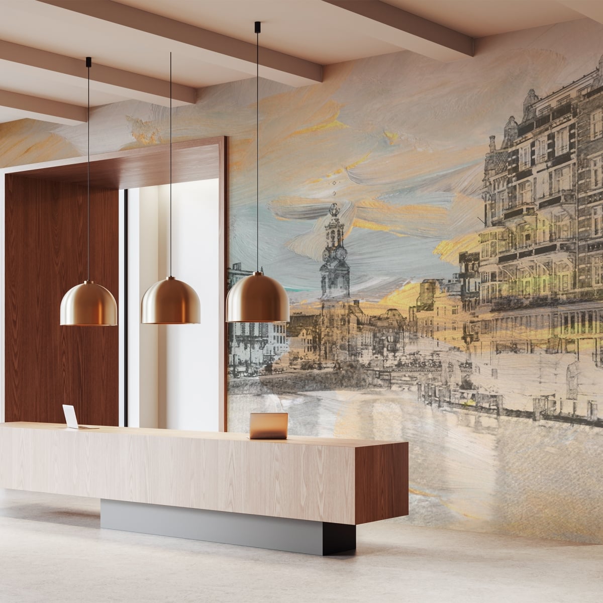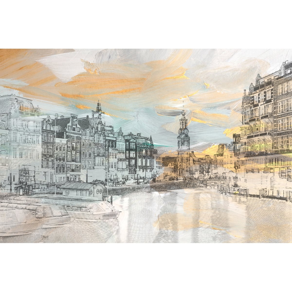 Bring the breathtaking glow of the "Golden Hour" into your space. This mural reimagines a classic European cityscape complete with iconic canal-front architecture and historic towers, through a richly textured, impressionistic lens. The design features bold, sweeping brushstrokes in gold, amber, and soft grey that mimic the play of light on water and stone, creating a vibrant, high-end gallery feel on any wall.