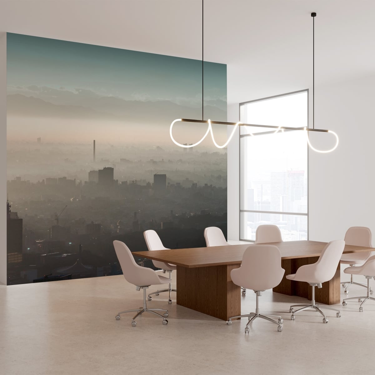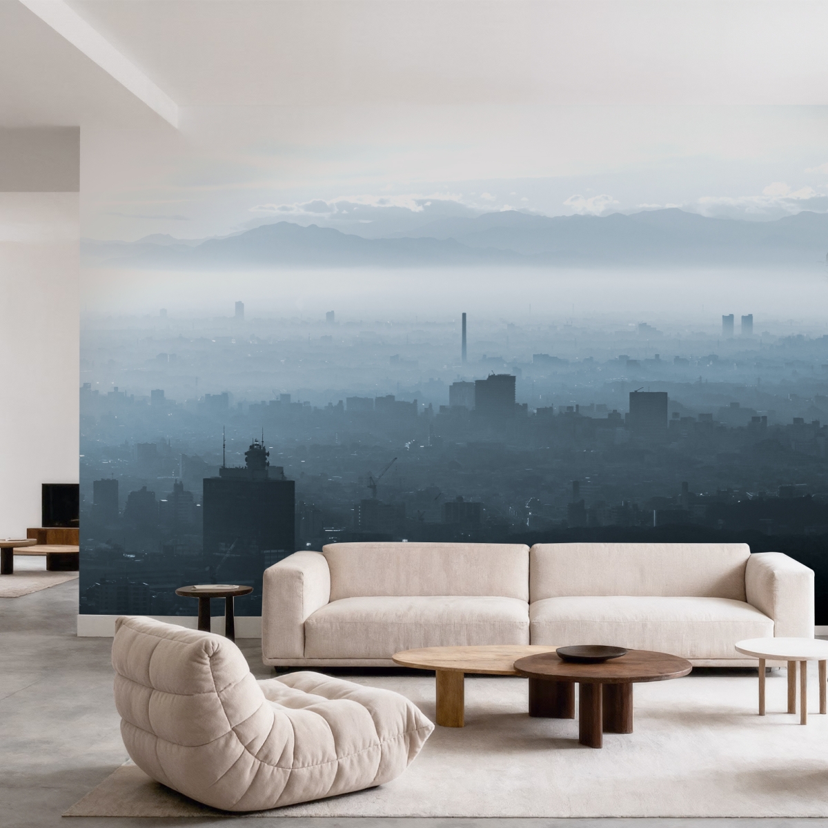 Experience the quiet side of the metropolis. This mural captures a city waking up under a blanket of mist, where architecture meets the elements in a soft, ethereal glow. The muted palette of teals, greys, and warm highlights makes it an ideal choice for a sophisticated office or a calming bedroom sanctuary.