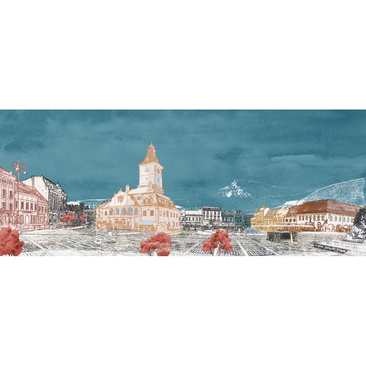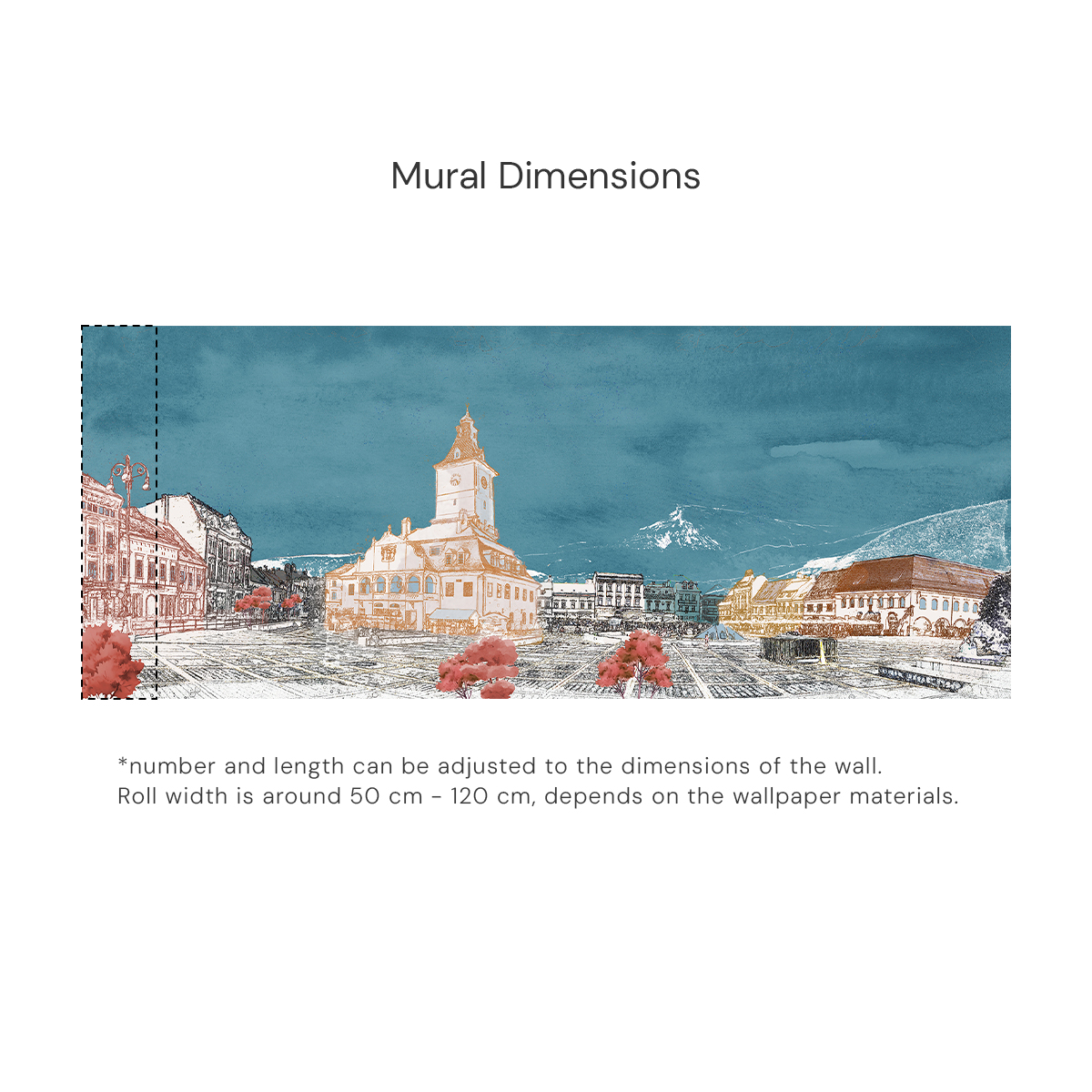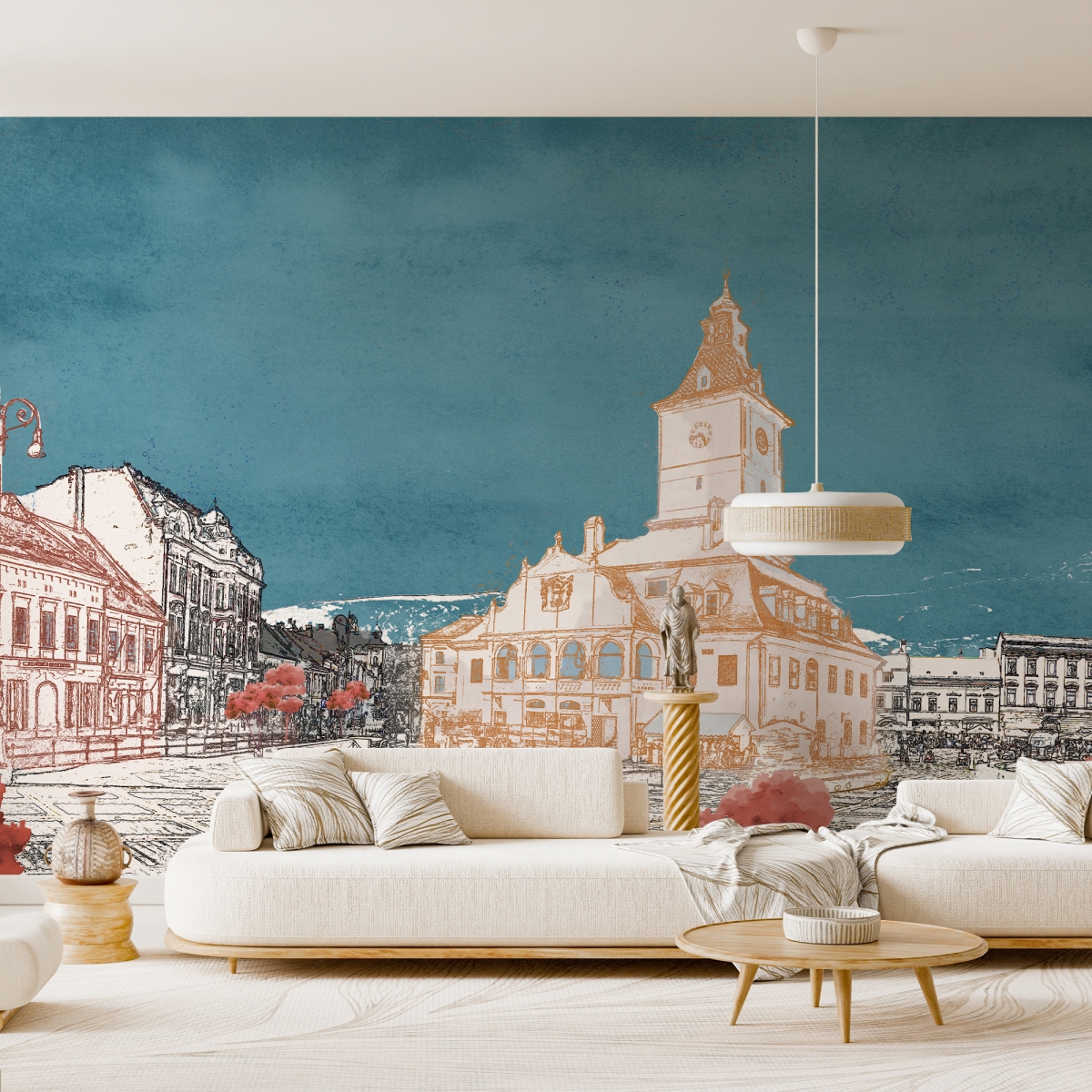 Capture the mood of the city. "The Plaza" is more than just a wall covering; it’s an atmospheric journey. The contrast between the warm, terracotta tones of the buildings and the cool, teal-blue sky evokes the feeling of a city at dusk. This mural adds a sense of grand scale and intellectual curiosity to any space, making your walls feel like a curated gallery piece.
