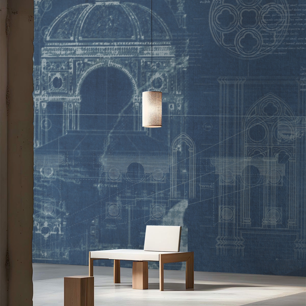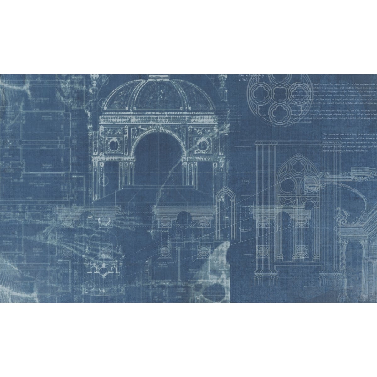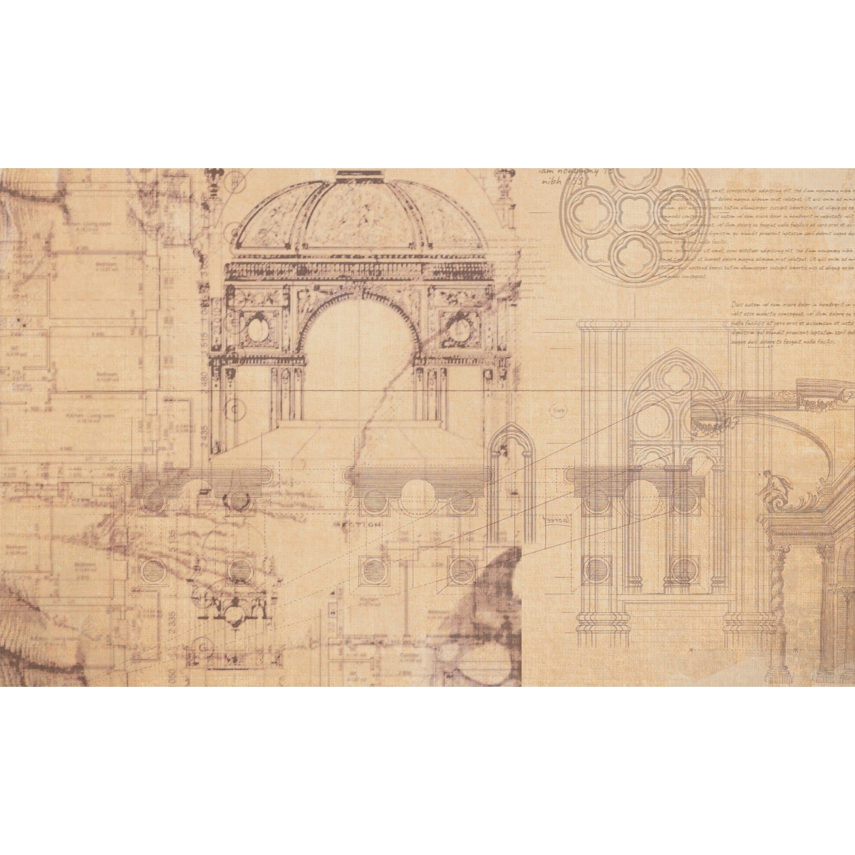 The design features a layered "palimpsest" effect, where multiple architectural drafts overlap one another. It highlights grand domed structures, intricate arched portals, and detailed Gothic rose windows. These are juxtaposed with modern technical floor plans and faint Latin-style calligraphy, suggesting a bridge between ancient craftsmanship and modern planning.