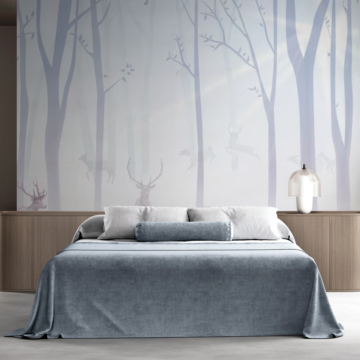 For those who seek calm and sophistication, this mural is an ideal focal point. The minimalist composition features clean, vertical lines of bare trees dissolving into a soft mist. The pale, silhouetted deer add a quiet presence without overwhelming the space. This is a design that is both striking and incredibly soothing, perfect for creating a light, airy, and deeply tranquil atmosphere in a modern home or office.