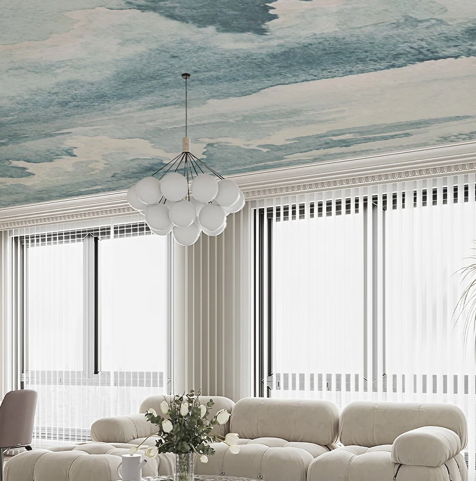 You can choose mono-color wallpaper in light or dark tones for a refined, and eye-catching effect. This color option can make the ceiling a focal point without overwhelming the space.