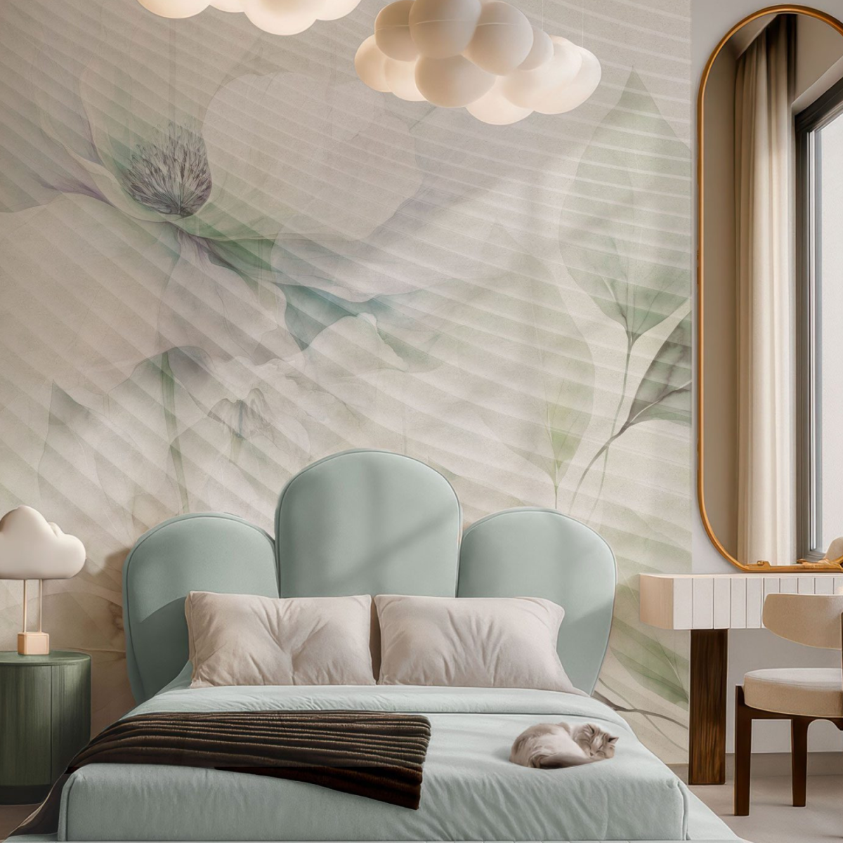 “Echo” pairs a delicate floral composition with a sequence of soft curves. Faded petals and leaves emerge naturally among the lines, shaping a balanced and harmonious design. An elegant choice for welcoming interiors.