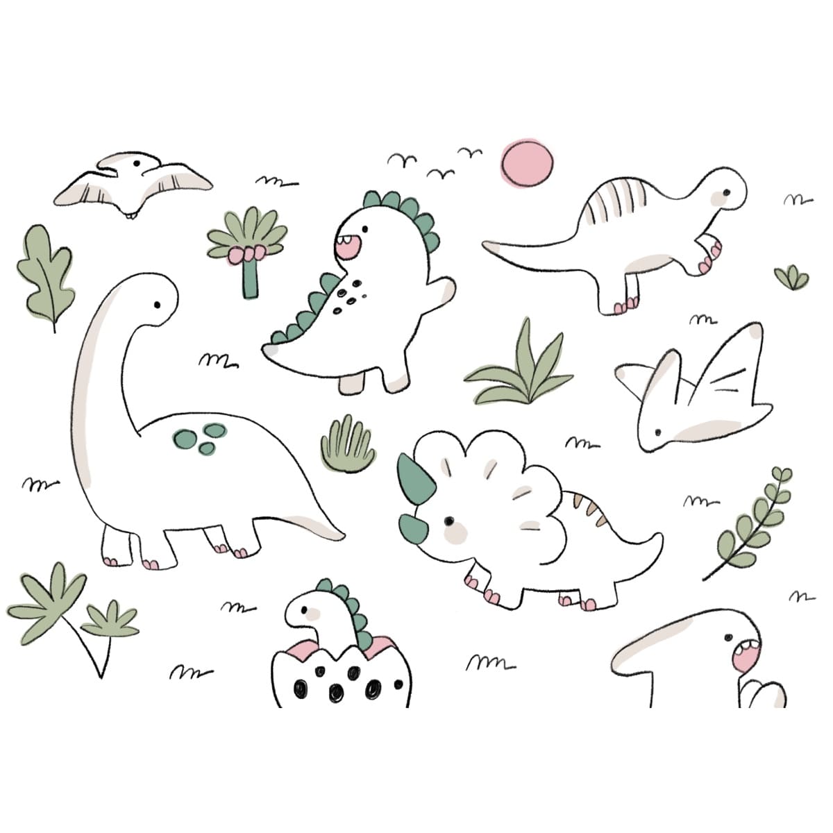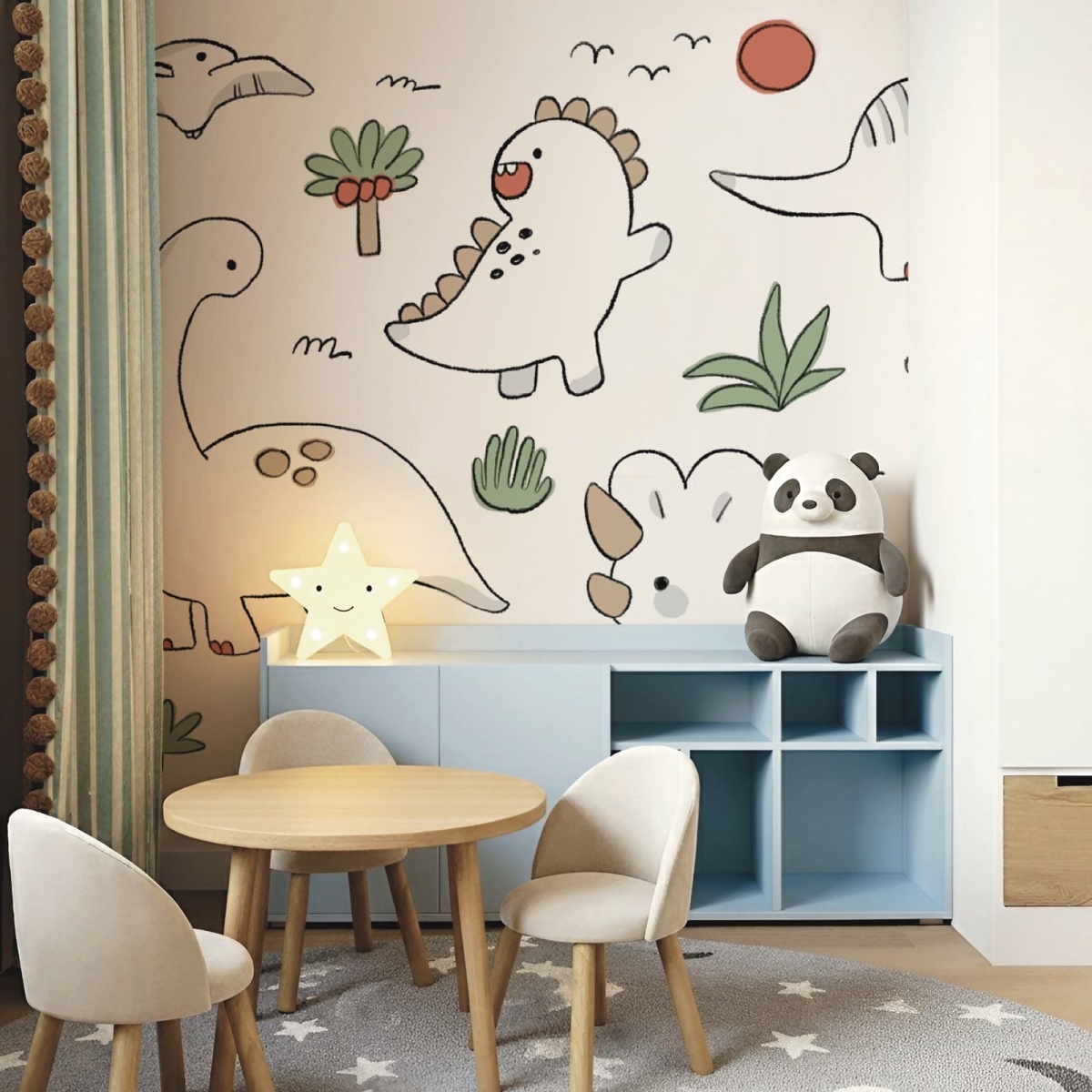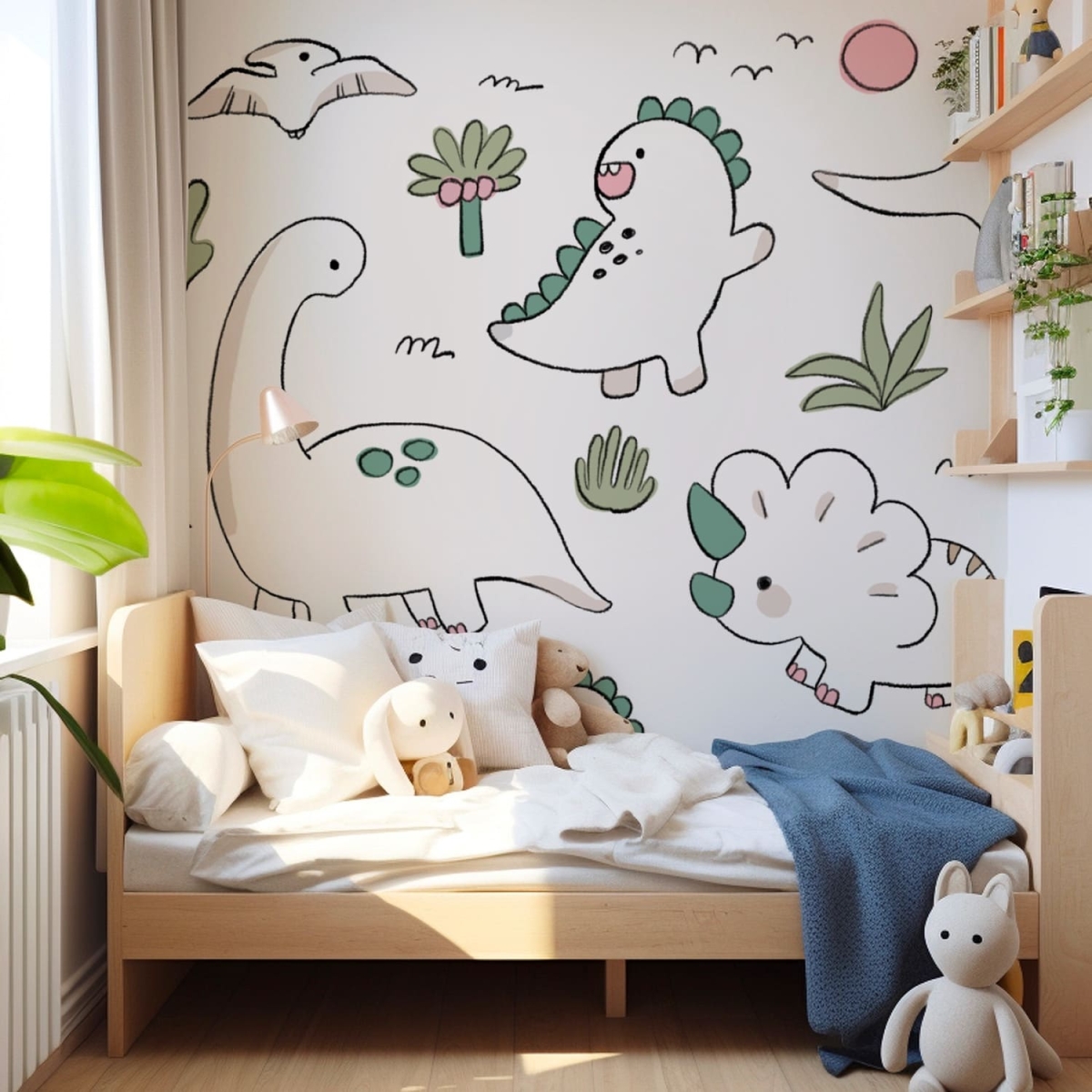 Dino Sketch Land is a gentle mural featuring pastel, doodle-style dinosaurs that add a sweet and calming touch to any child’s room. The soft color palette creates a warm, soothing environment while keeping the design fun and engaging. Each sketched dinosaur feels friendly and inviting, making it perfect for nurseries or quiet play spaces. This mural brings a comforting charm that grows with your child’s imagination.
