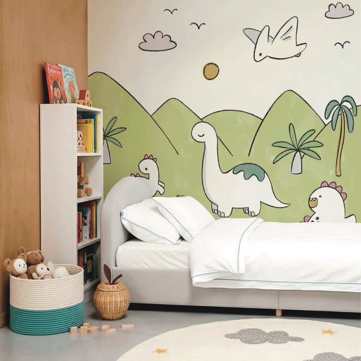 Dino Sketch World turns your wall into a whimsical storybook filled with charming sketched dinosaurs and soft imaginative details. The playful illustrations create a friendly prehistoric world that kids can explore every day. Its gentle tones and storytelling vibe make it perfect for bedtime corners or reading nooks. This mural invites children into a magical dino world where creativity comes to life.