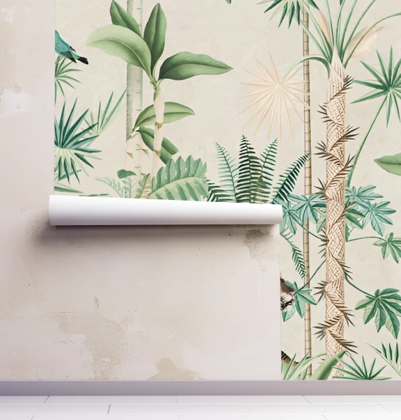 This wallpaper shows their natural movements in a creative way. The detail encourages children to imagine fun jungle stories. The bright feathers make the nursery feel cheerful and dynamic. The flora and fauna of this wallpaper complete the atmosphere with beauty.