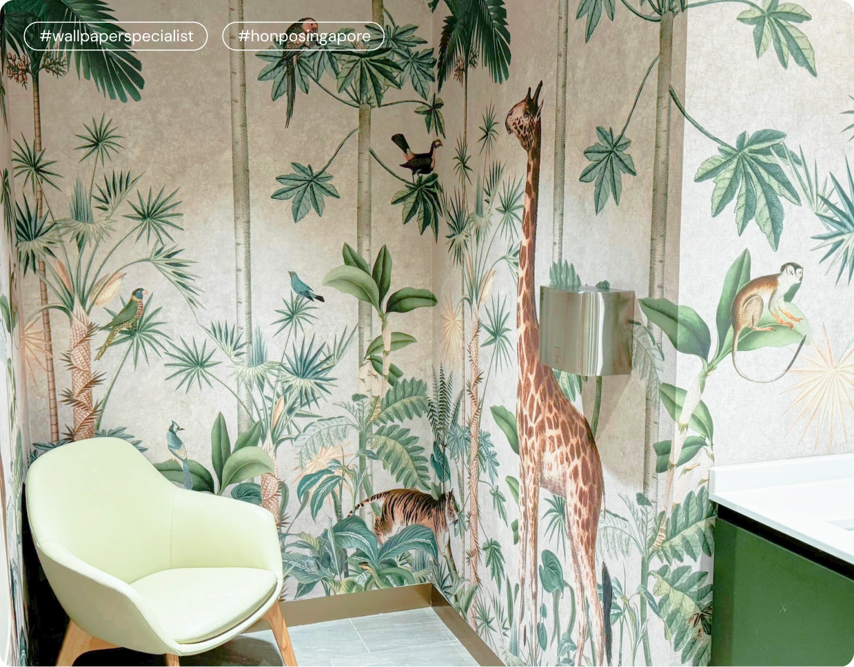The nursing room wallpaper installation in Singapore completely transformed the space into a lively and imaginative environment. In this project, we used kids mural wallpaper that brought a playful jungle scene to life. The design shows tall green trees, oversized tropical leaves, and cheerful animals like giraffes, monkeys, birds, and even a tiger. This project aimed to create a functional nursing room and a warm and adventurous setting where children feel engaged and parents feel comfortable. The mural wallpaper adds excitement, color, and character to turn the nursing room into a child-friendly sanctuary.