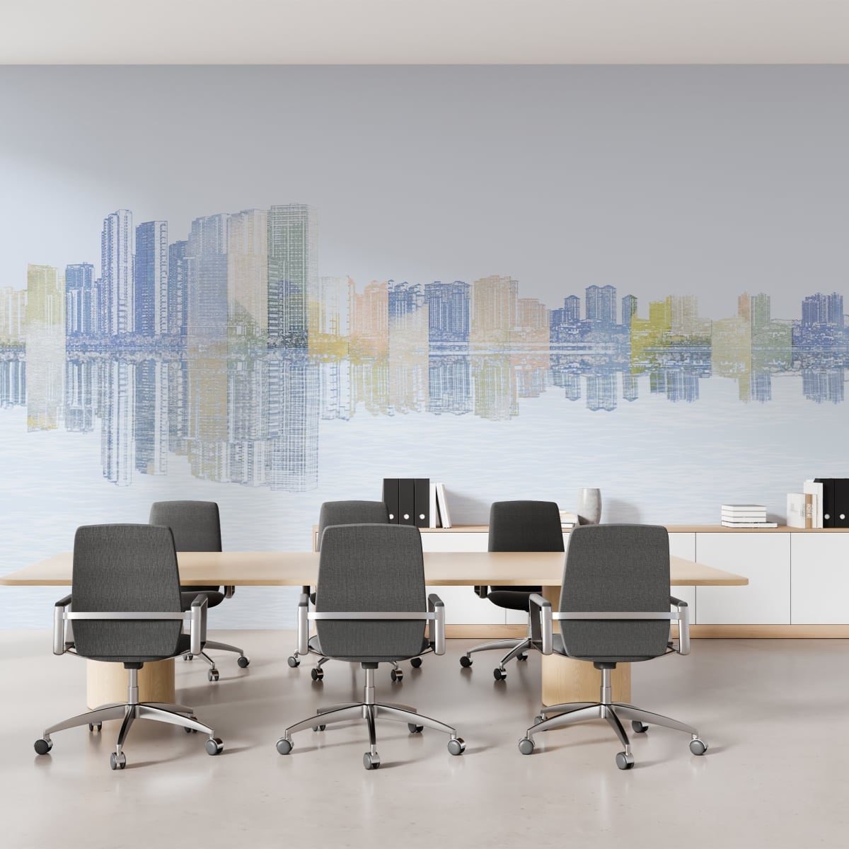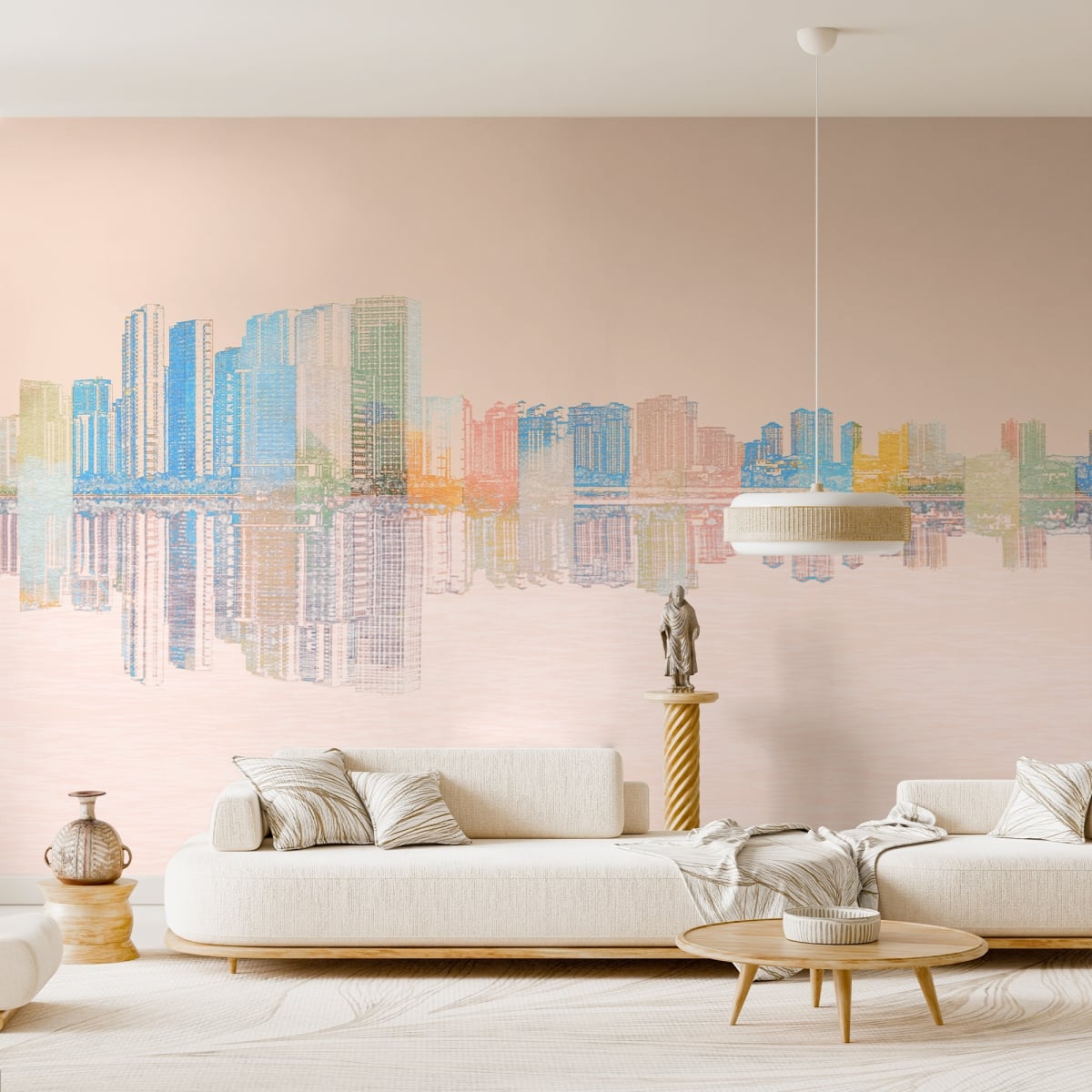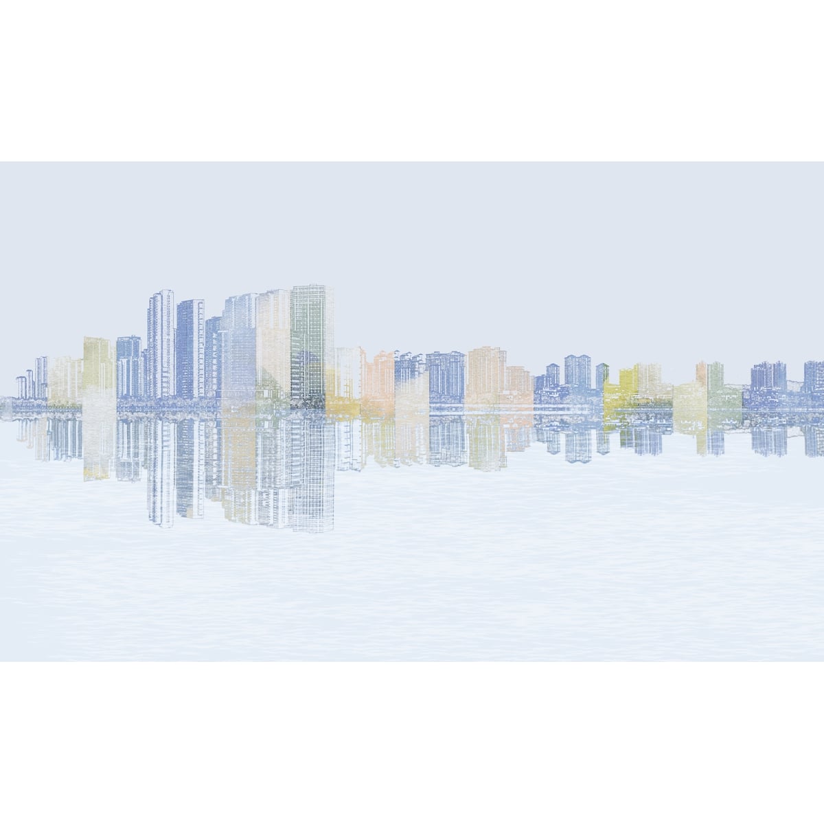 Infuse your home with the soft glow of a city at rest. This mural reimagines the traditional skyline through a dreamlike, watercolor lens, blending architectural precision with a delicate pastel palette. It’s the perfect choice for a modern home office or a sophisticated living area where you want to celebrate city life with a touch of artistic whimsy and lightness.