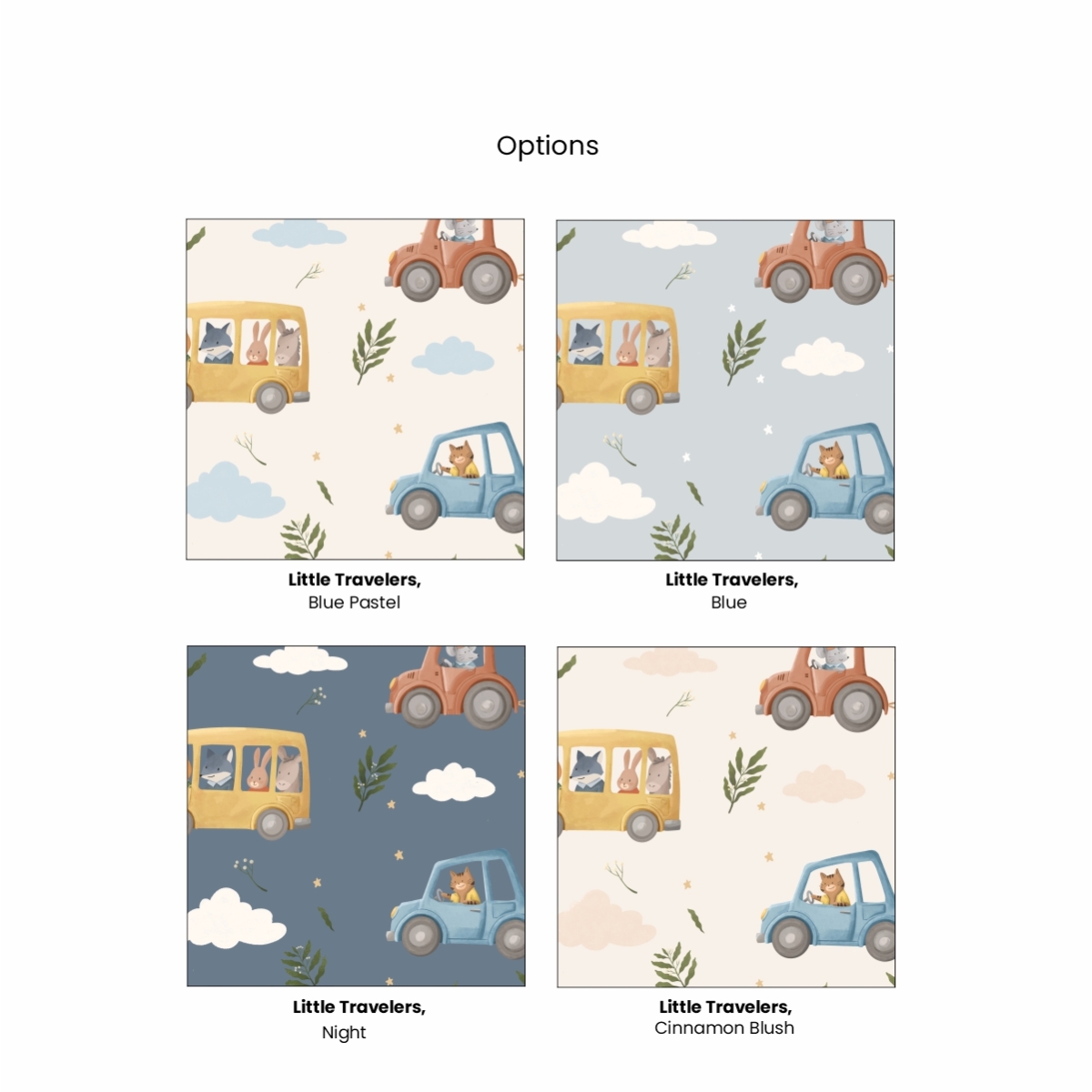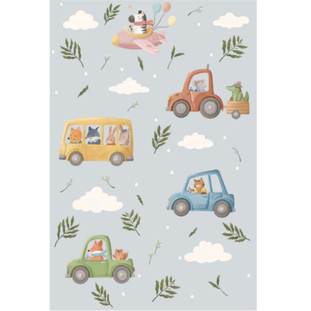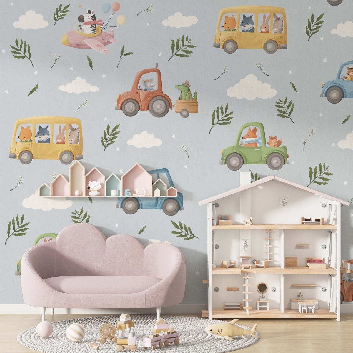 This delightful wallpaper showcases adorable animal friends adventuring through a whimsical world of cars, buses, and even a little airplane. Soft pastel tones, floating clouds, leafy accents, and tiny stars add a calming and playful charm. Perfect for nurseries, kids’ bedrooms, and play areas, this design brings a sense of movement, joy, and imagination to any space.