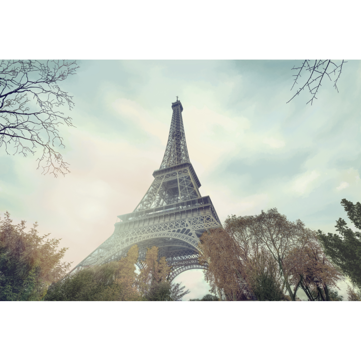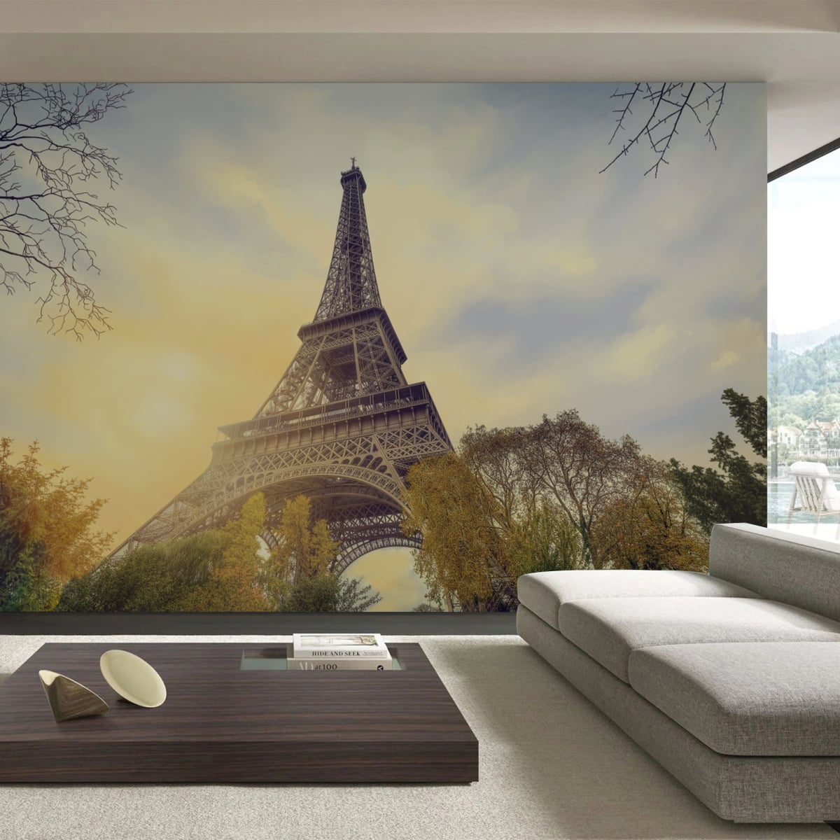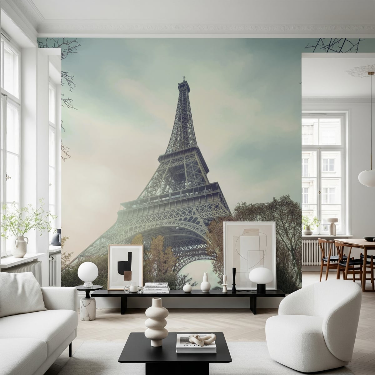 Bring the romance and iconic beauty of Paris right into your home with the "Parisian Dreams" mural wallpaper. This captivating design features a low-angle, dramatic view of the Eiffel Tower (La Tour Eiffel), framed by soft, autumnal trees and a gently clouded sky.