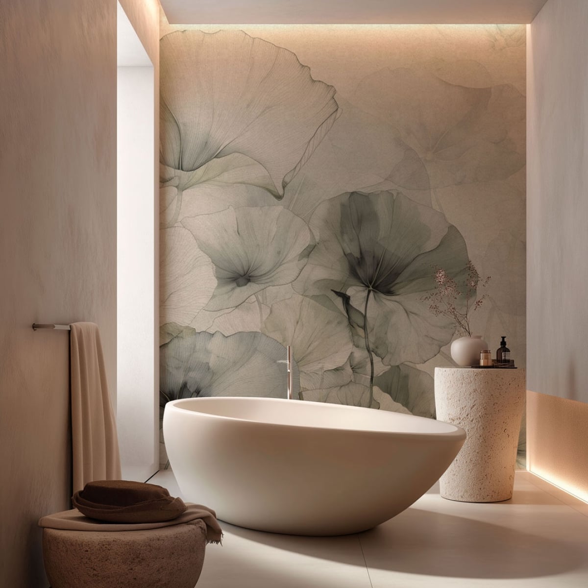 Warm-toned tropical plants with refined texture offer a rich and calm backdrop.