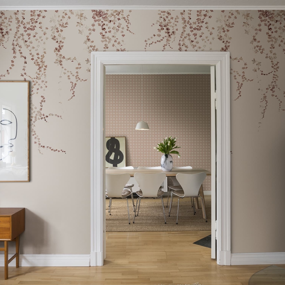 Aralia is a wall mural with life like ivy. Hanging or climbing (depending on how you hang it) Aralia features ivy vegetation on a textile surface. This is a wall mural. That means that the image is printed like a canvas across several strips of wallpaper.