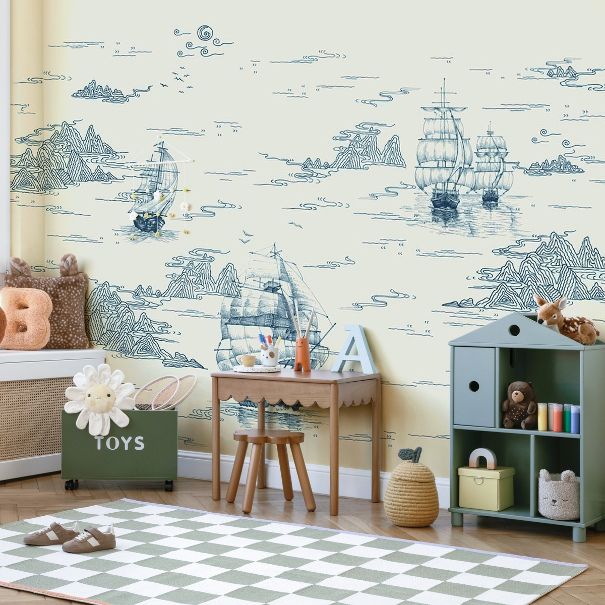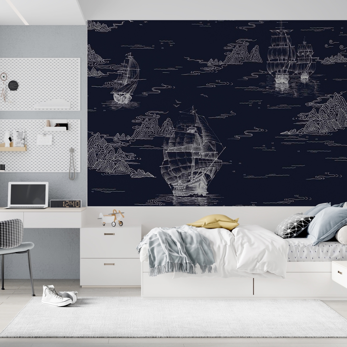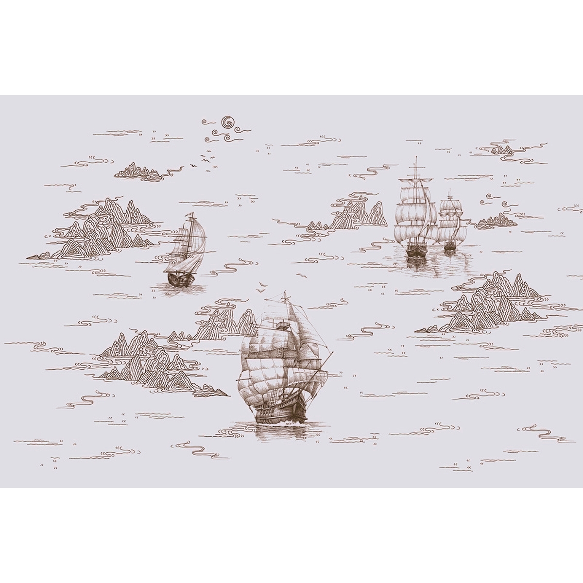 Embark on a voyage of style with our Vintage Maritime Voyage Mural. This sophisticated wall covering features intricately detailed tall ships gliding through a sea of clouds and mountain peaks. Rendered in a classic monochrome palette, it brings an air of timeless adventure and scholarly charm to a home office, study, or refined living space.