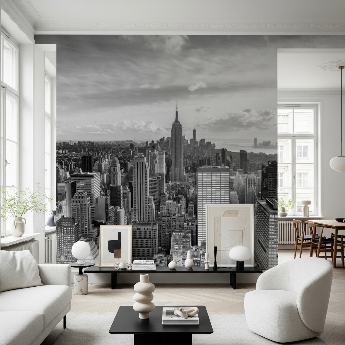 Elevate your perspective with the 'Skyline Vista' mural wallpaper. This breathtaking photographic design captures the sheer scale and iconic beauty of the New York City skyline, transforming your wall into a window high above the metropolis.