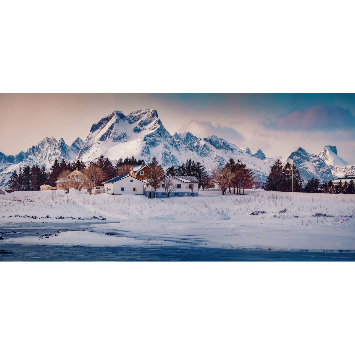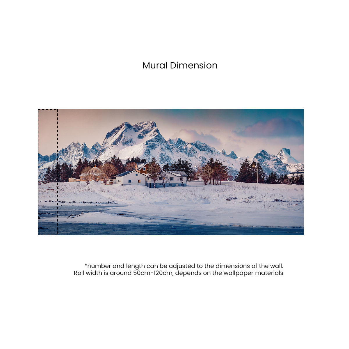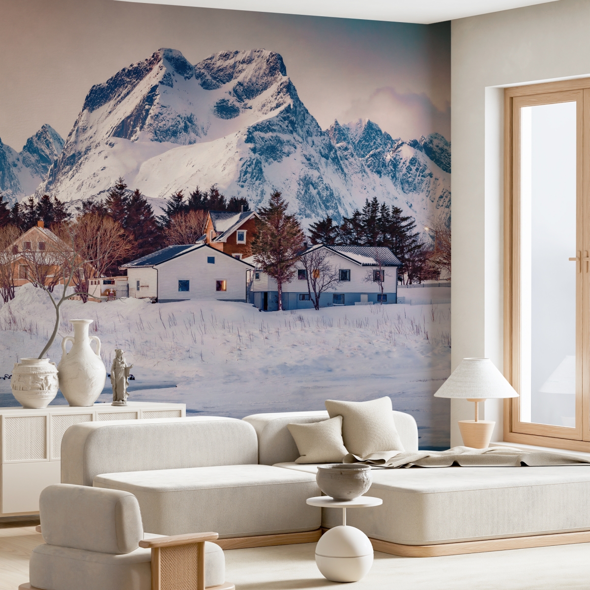 Transport your room to the edge of the world with this stunning Arctic landscape. This mural features a cluster of cozy Nordic cottages nestled beneath the towering, snow capped peaks of a majestic mountain range. Bathed in the soft, ethereal light of a winter sunset, it’s a design that brings a sense of vastness, quietude, and a touch of wanderlust to any feature wall.