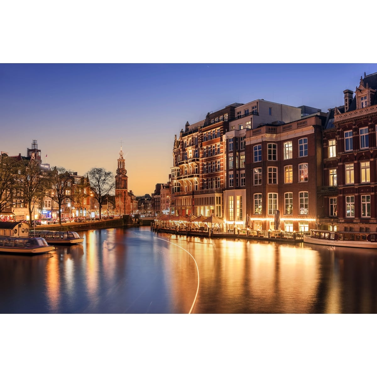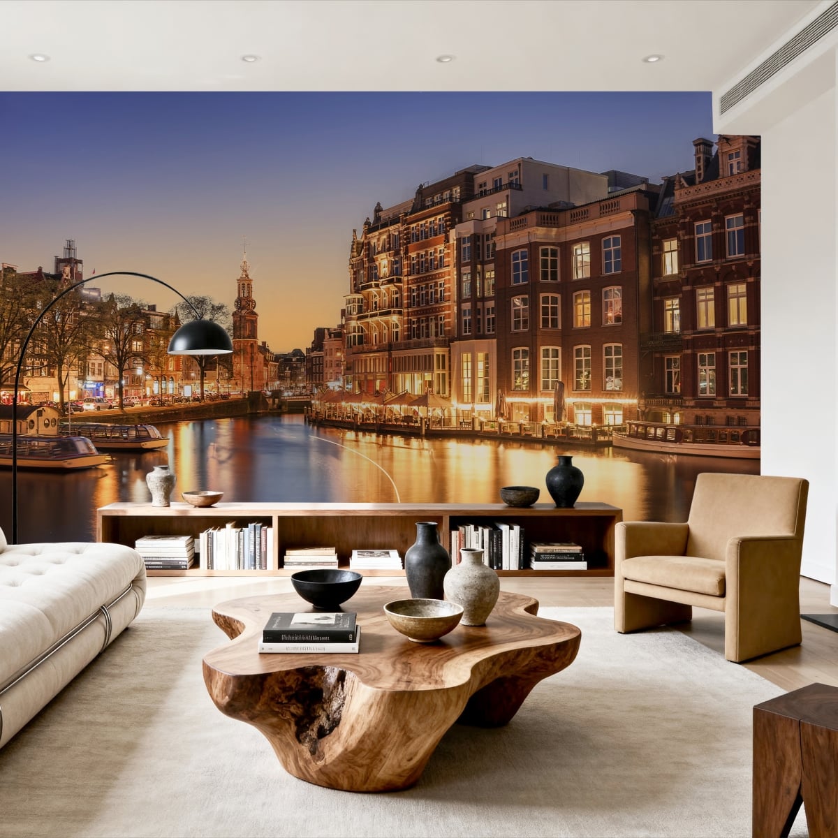 This mural wall covering brings the enchanting glow of Amsterdam at twilight into your interior, turning any wall into a luminous, architectural masterpiece. The design features the historic brick facades of the Amstel riverfront, illuminated by the warm, golden light of the evening.