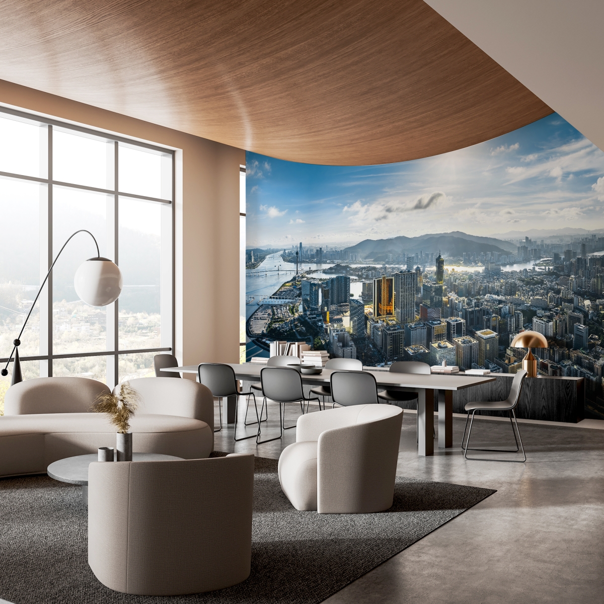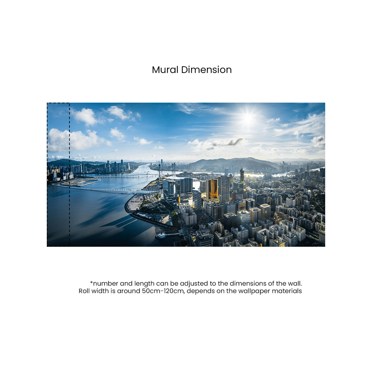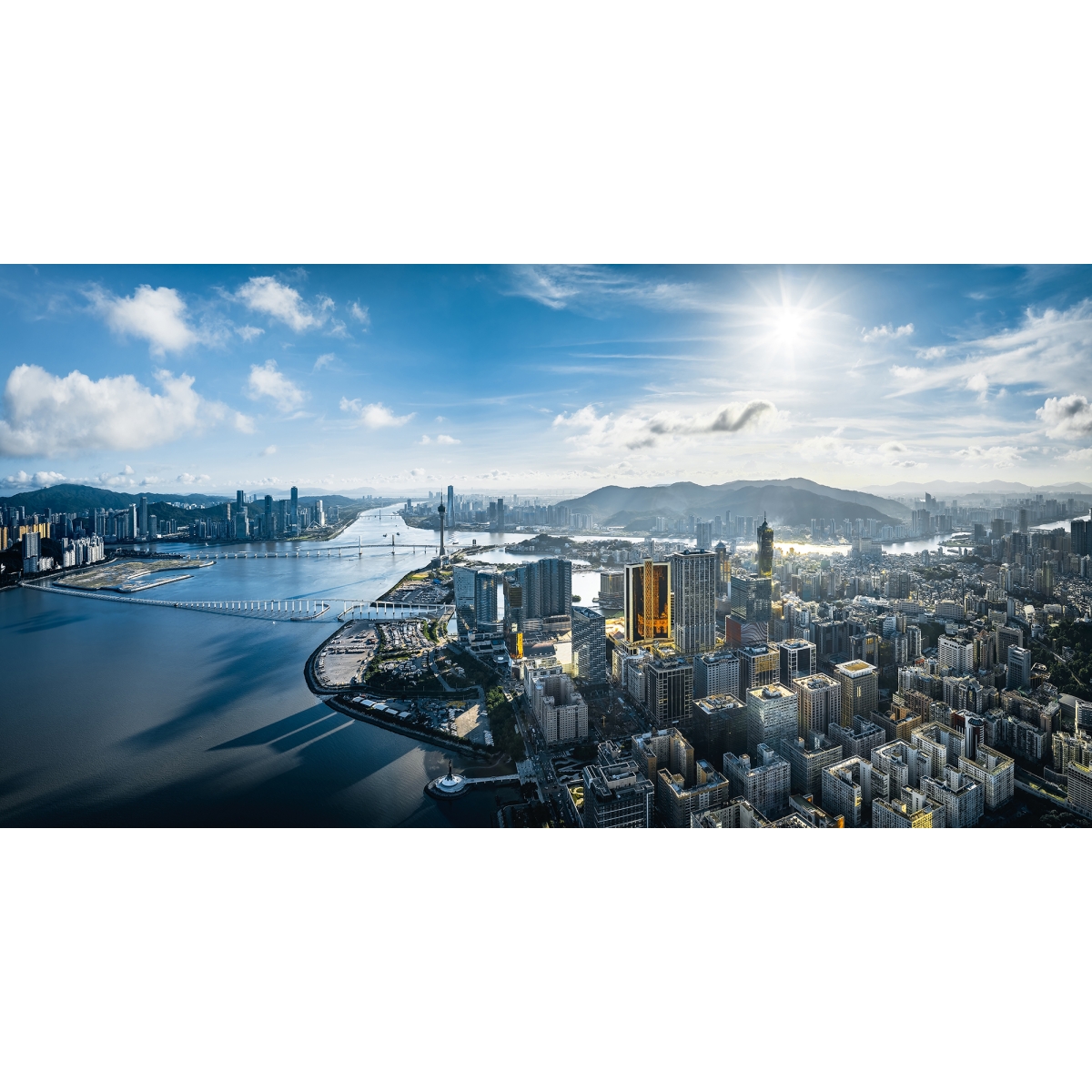 Bring the dynamic heartbeat of the city to your walls. This ultra-high-definition mural features the dazzling skyscrapers and expansive bridges of Macau, where the river meets the mountains. The brilliant sun and vast blue sky create an uplifting, high-energy environment ideal for a creative agency or a modern feature wall.
