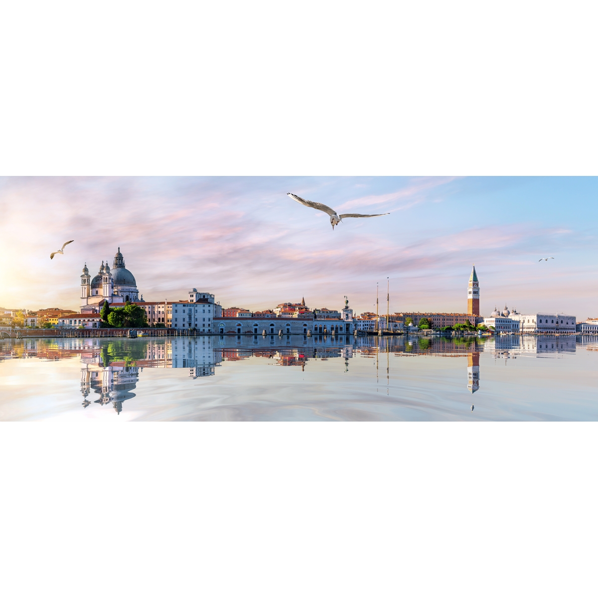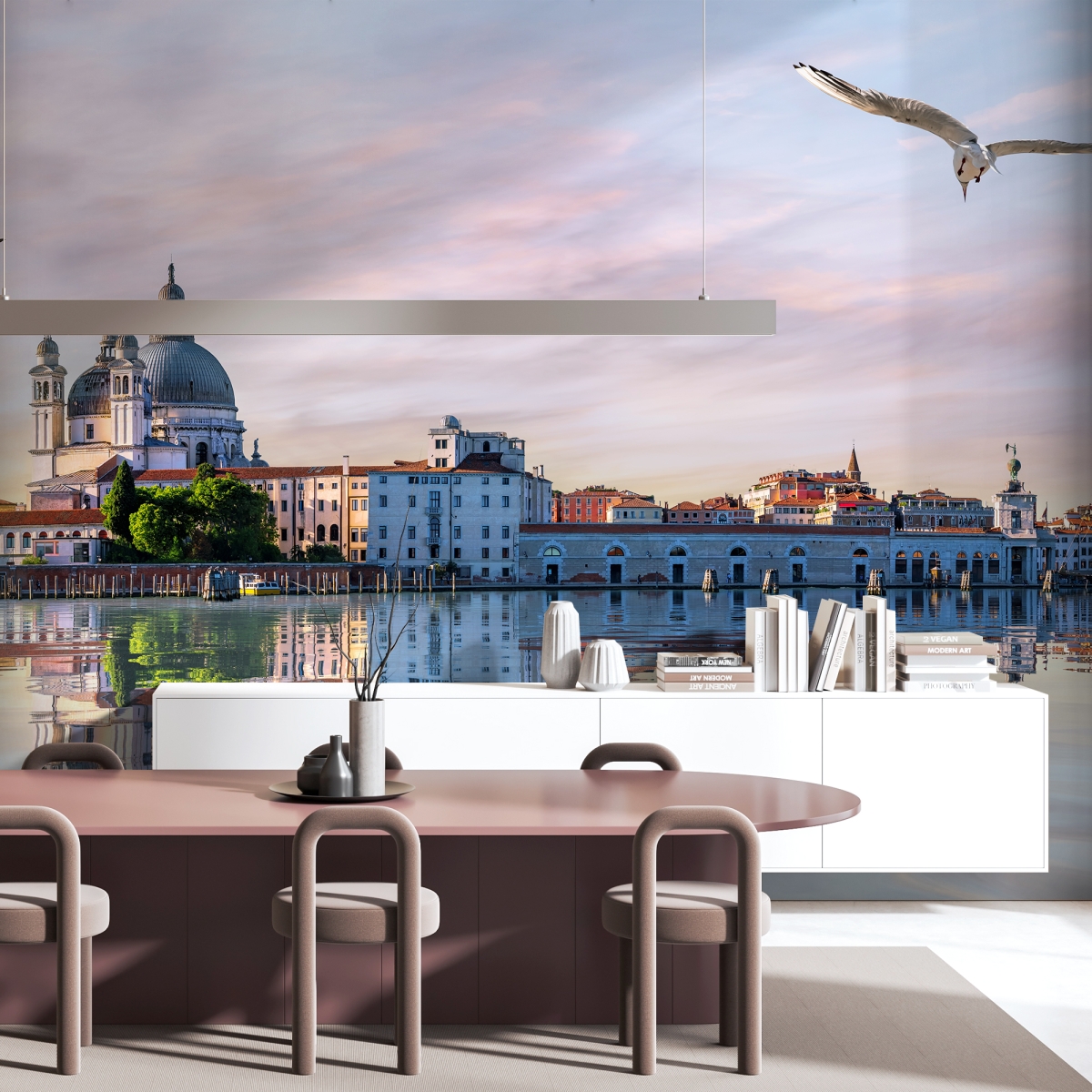 Step into a masterfully composed cityscape where history meets the sky. This wide-angle wall covering uses a soft pastel palette and mirrored water reflections to create an immersive, window like effect. The soaring gulls add a touch of life and freedom, making it a perfect feature wall for modern interiors looking to blend classical architecture with an airy, open feel.