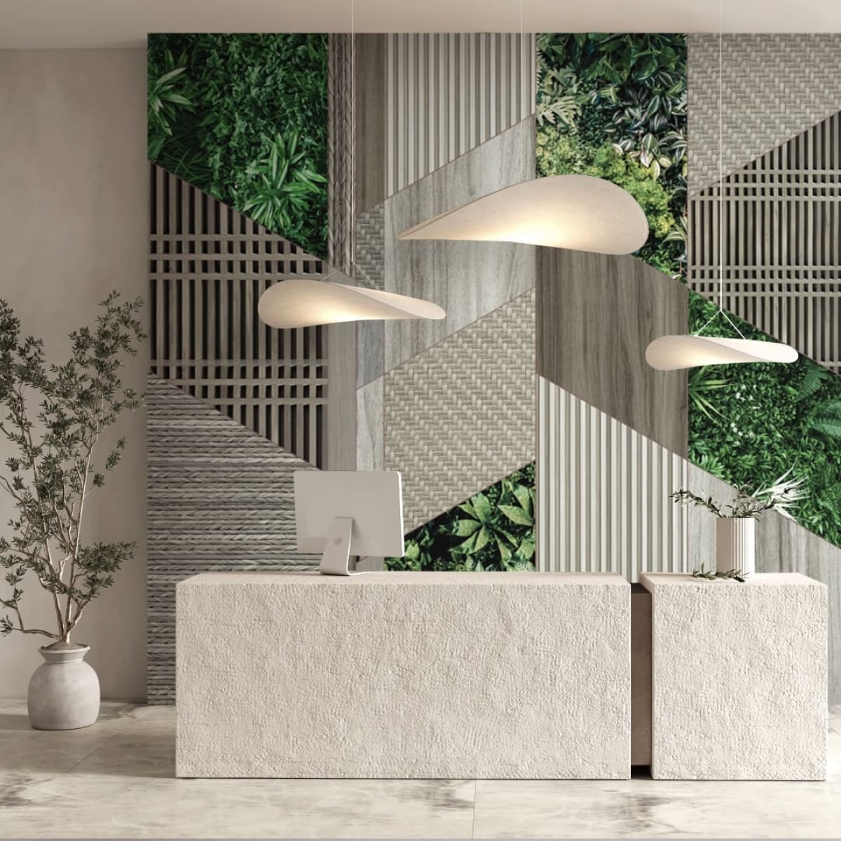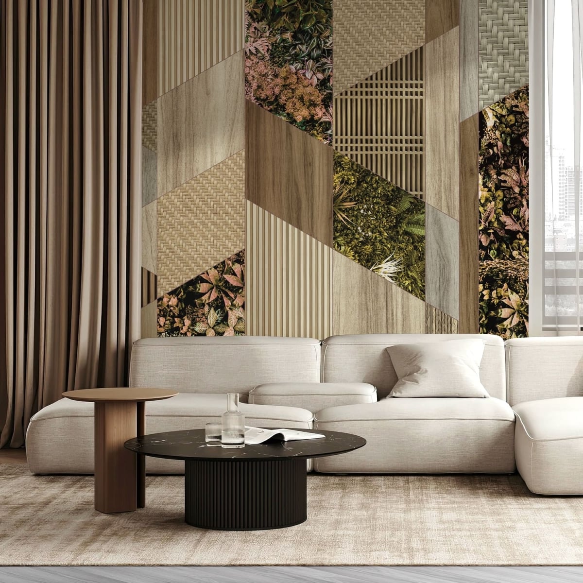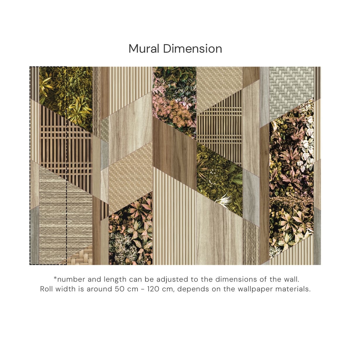 Featuring clean geometric wood panels paired with integrated green plant accents, this mural offers a fresh take on modern interior design. The structured layout is softened by natural greenery, creating a refined biophilic aesthetic. Perfect for contemporary spaces, it adds warmth, texture, and a connection to nature