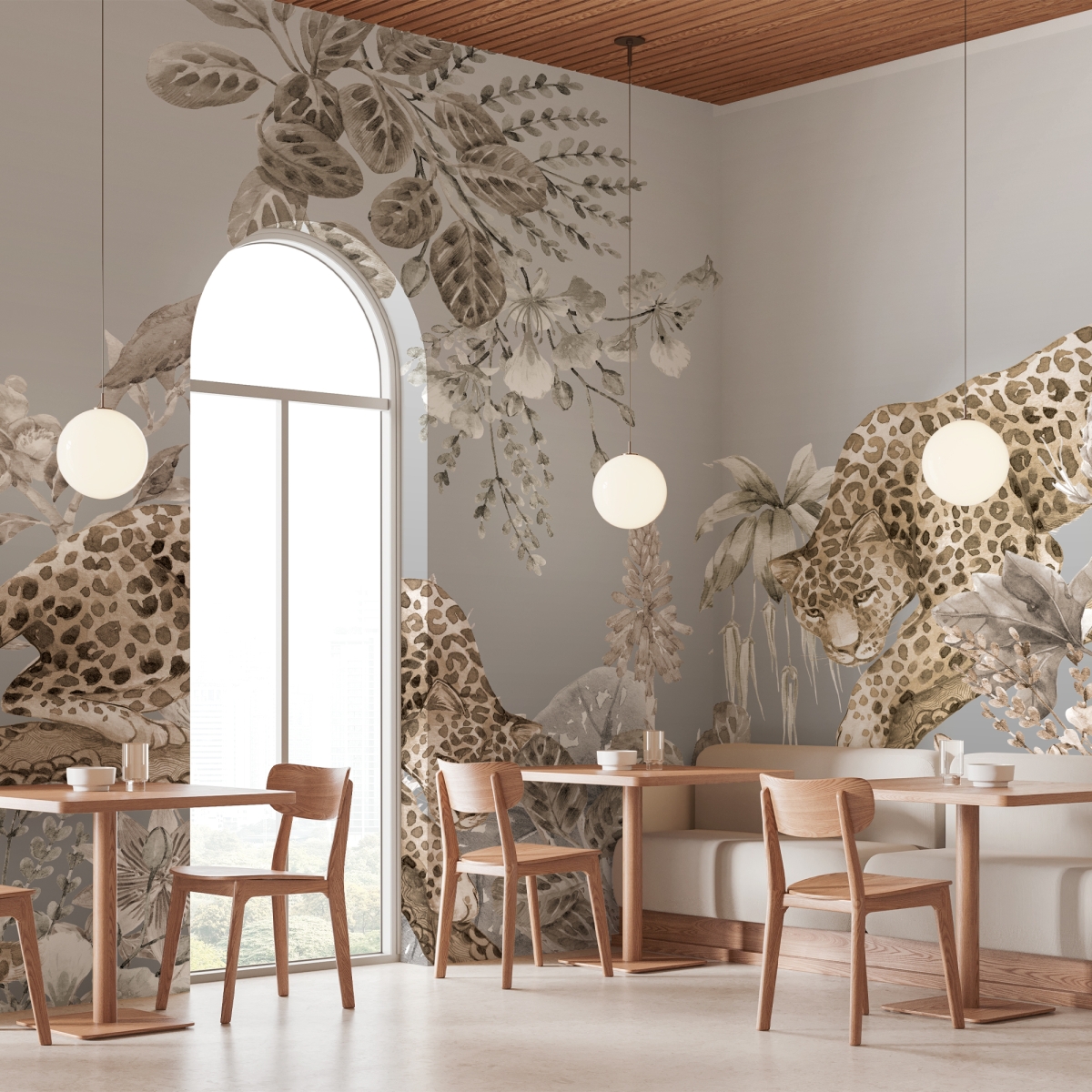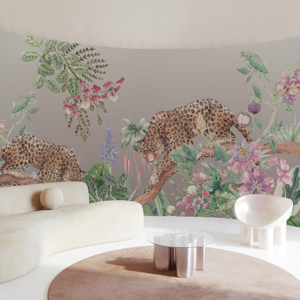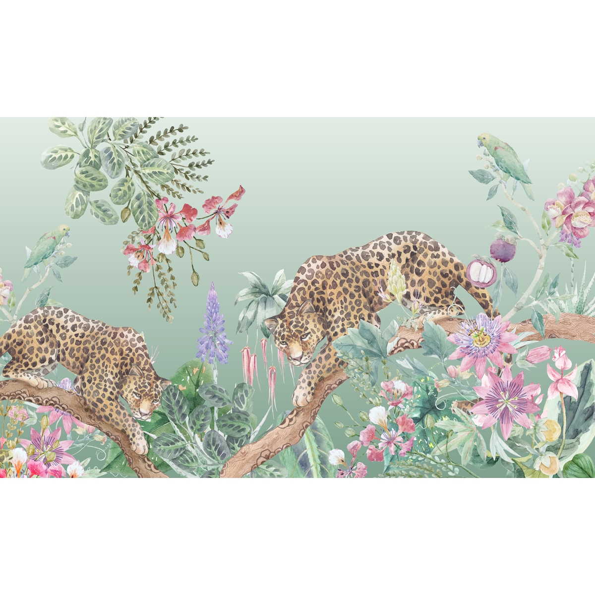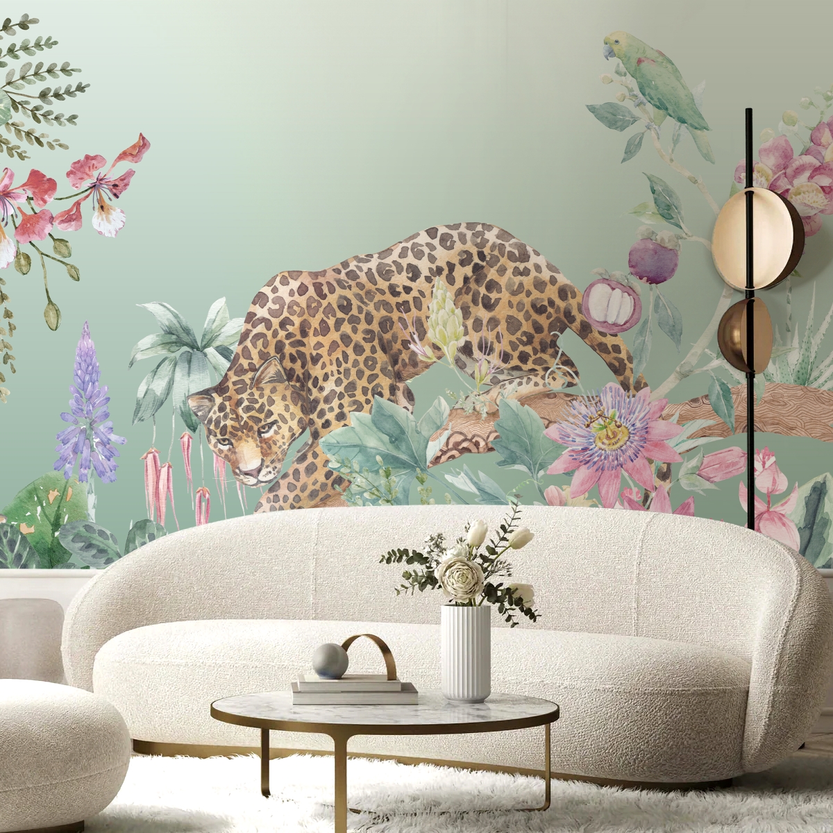 The gentle wild Who says a leopard can’t be serene? "Sovereign Flora" balances the raw power of the big cat with the delicate beauty of blooming botanicals. The muted pastel palette pinks, purples, and soft greens softens the jungle theme, making it an ideal choice for a sophisticated nursery, a creative home office, or a chic powder room.