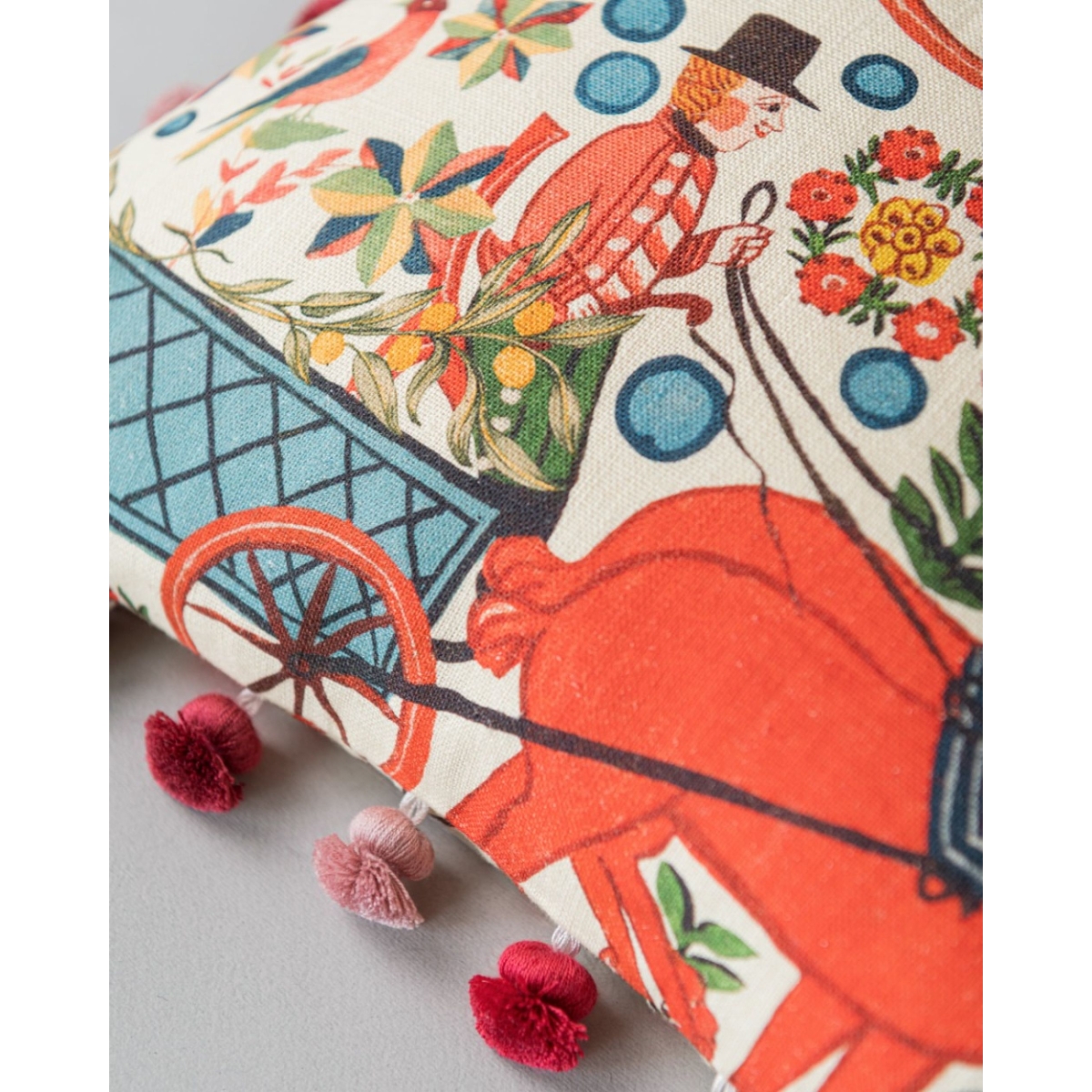 100% Linen, printed and stonewashed, Finishing : Fringes all around, Filling : Duck feather